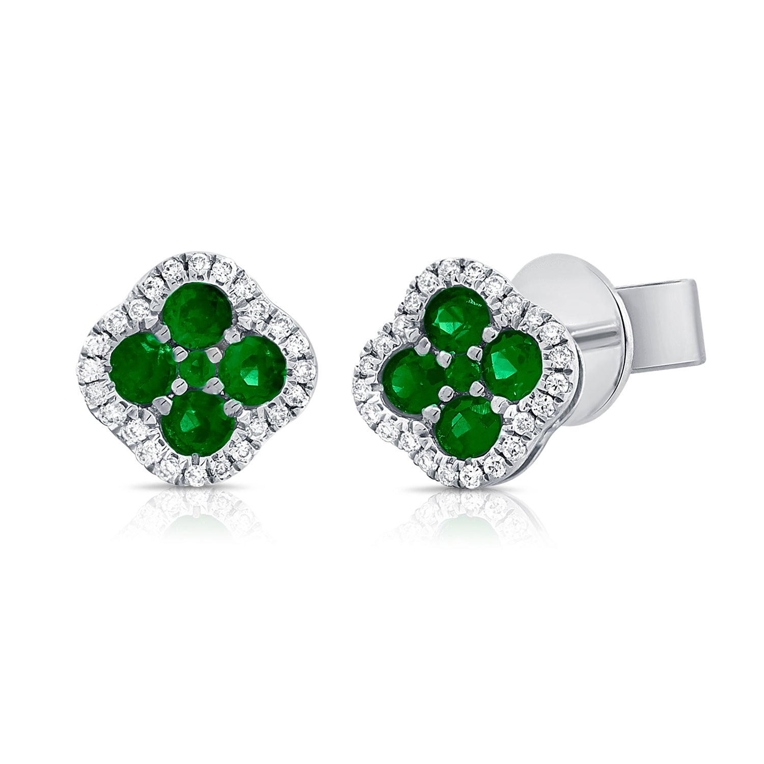 Add a pop of color with these 0.54 carat emerald and diamond clover stud earrings, crafted in 14K gold. Lush emeralds and a diamond halo shine in a 6.4mm design. Available in white, yellow, or rose gold-perfect for gifting or everyday elegance.