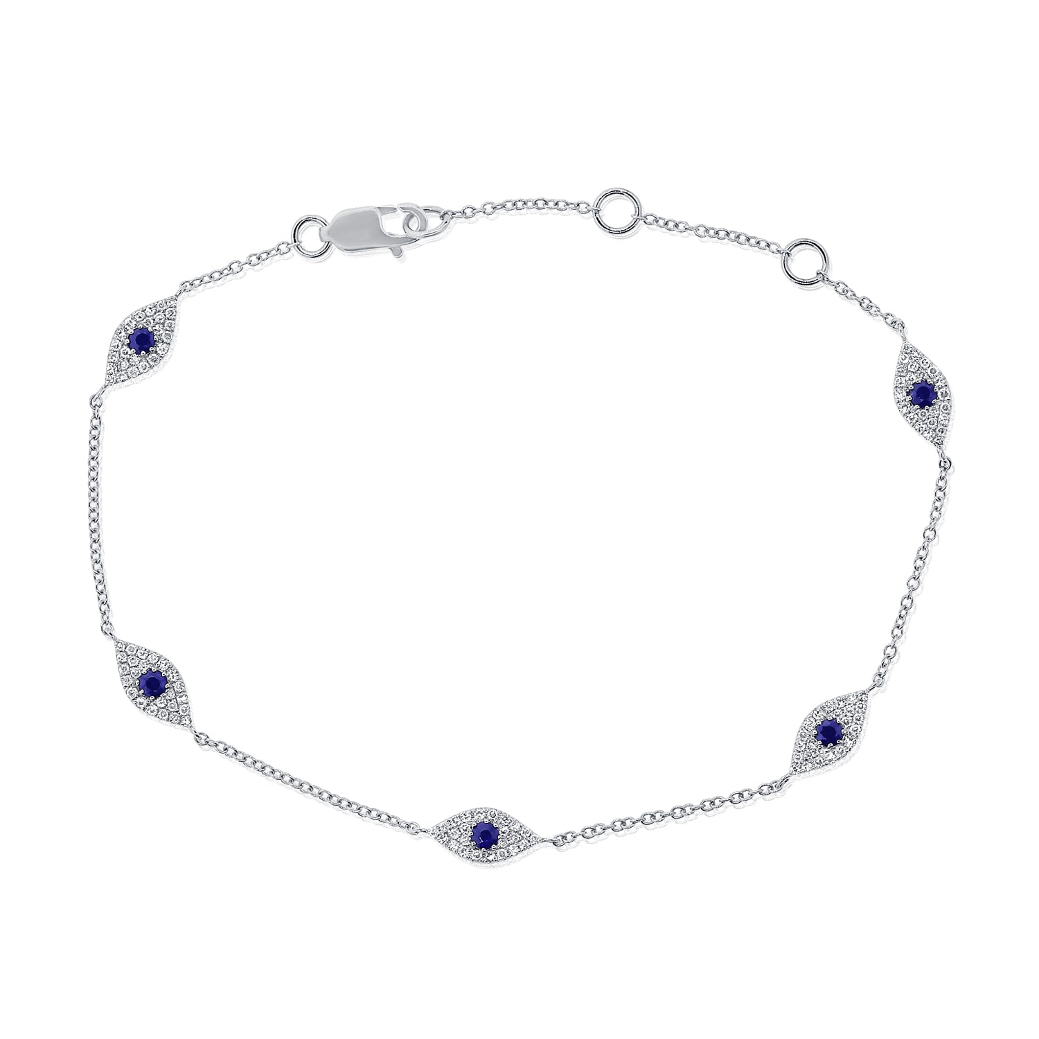 Protect yourself in style with our captivating Evil Eye Bracelet, adorned with exquisite sapphires and sparkling diamonds totaling 0.56 carats. This striking piece features the iconic evil eye symbol, known for its significance in warding off negativity and bringing good fortune.