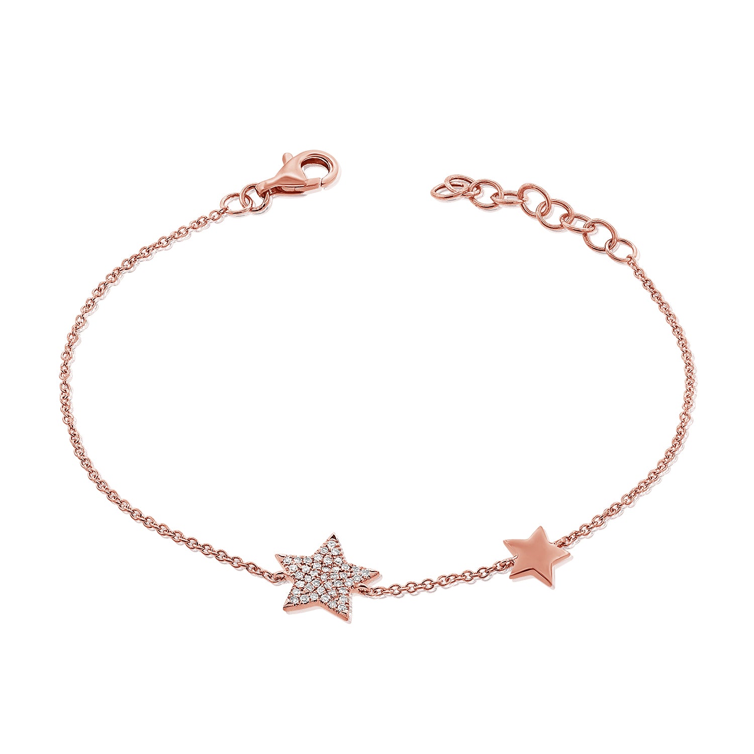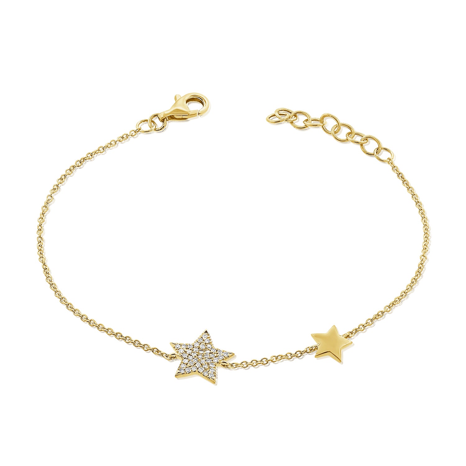 Shine bright with this dazzling 14K Gold Double Star Diamond Bracelet. Featuring a radiant diamond-encrusted star paired with a sleek polished star, this bracelet sparkles with 0.14 carats of diamonds for a celestial touch. Available in white, yellow, or rose gold, its delicate chain is adjustable for the perfect fit. This bracelet is a versatile and chic accessory, making it an ideal gift for someone special or a brilliant addition to your jewelry collection. Let your style reach for the stars!