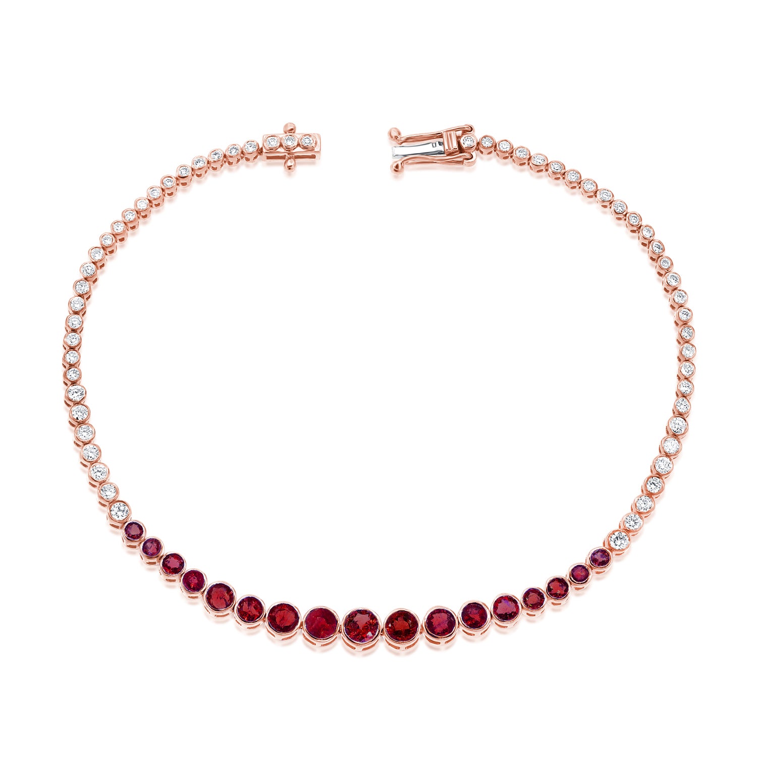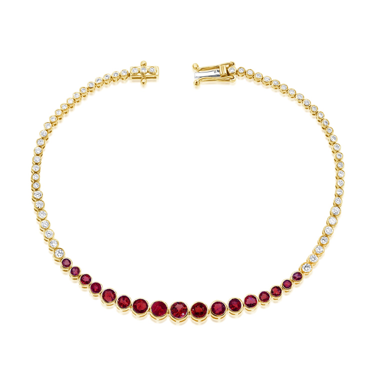 Elevate your jewelry collection with this breathtaking 2.45 carat ruby and diamond tennis bracelet, crafted in 14K white, yellow, or rose gold. Featuring a stunning array of round-cut rubies and brilliant diamonds, this piece showcases a classic bezel-set design, exuding timeless elegance and sophistication.