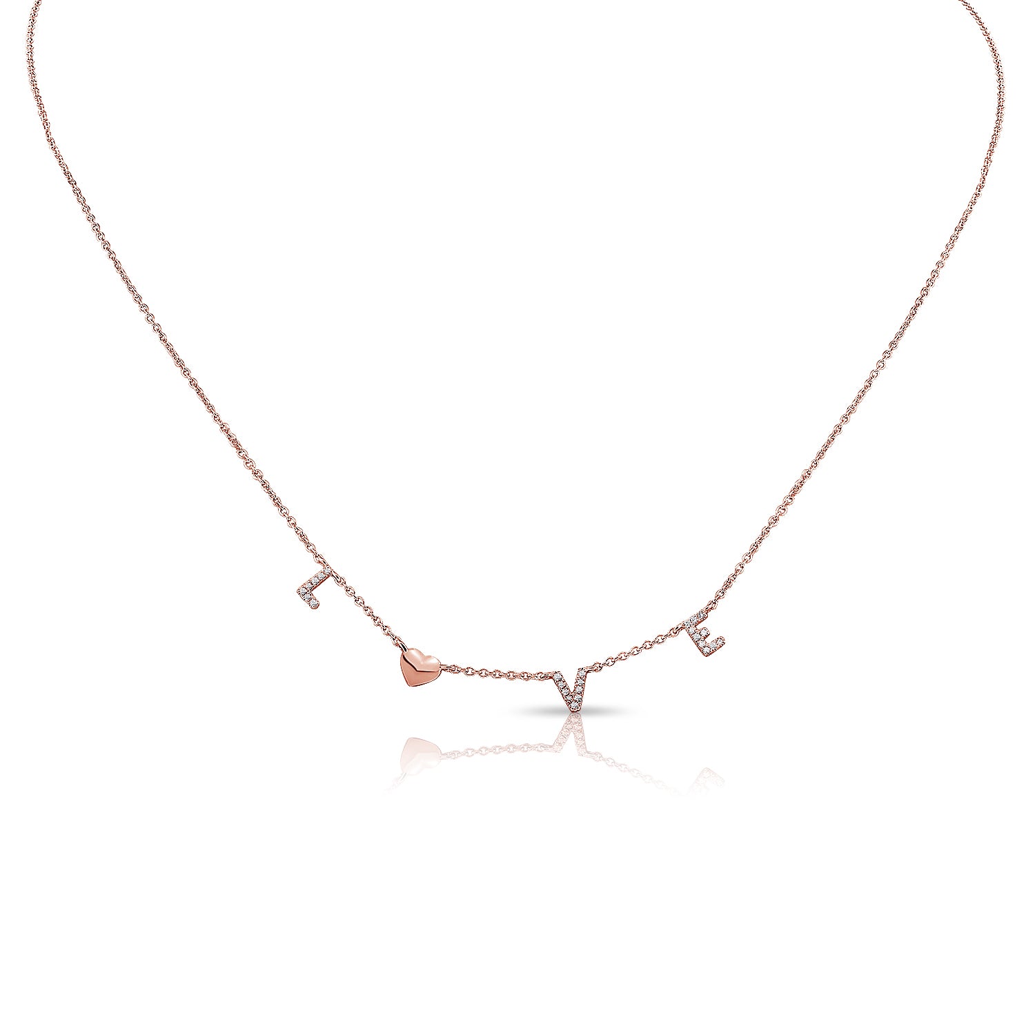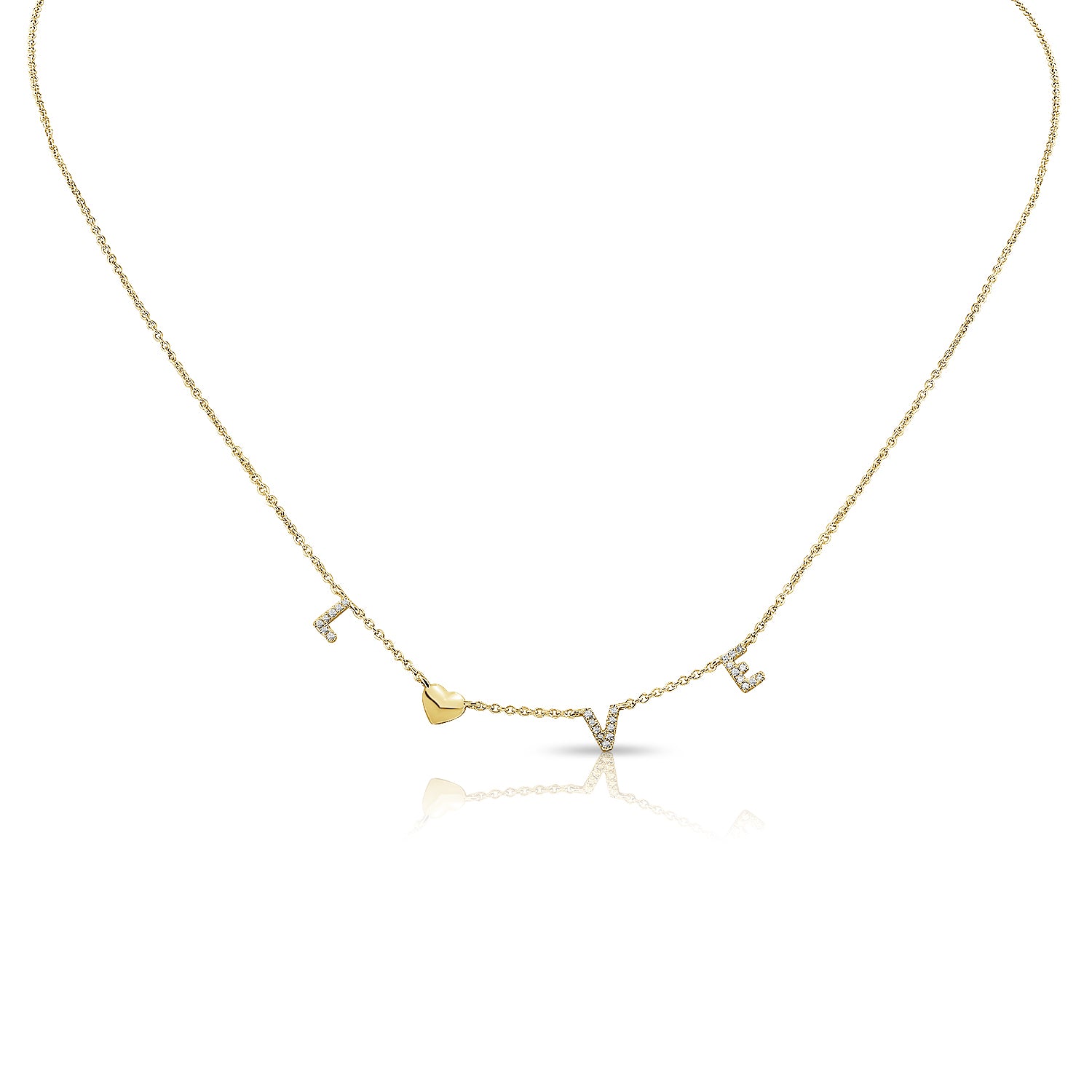 Elegance meets sentiment in this exquisite 14k gold heart & love necklace adorned with sparkling diamonds totaling 0.09 carats. Crafted to captivate, each delicate diamond is meticulously set within the heart motif, symbolizing enduring love and timeless beauty. Perfect for adding a touch of glamour to any ensemble, this necklace effortlessly combines sophistication with heartfelt emotion, making it a cherished addition to any jewelry collection.