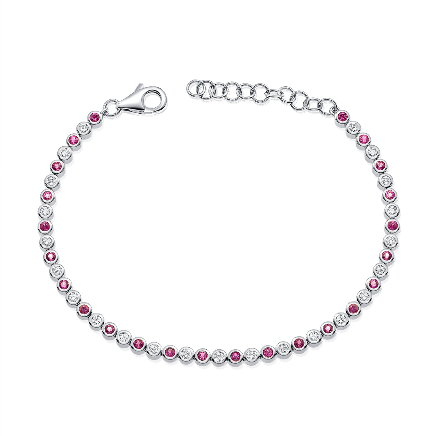 Indulge in timeless elegance with our 1.45 Carat Pink Sapphire and Diamond Tennis Bracelet, meticulously crafted in 14K White, Yellow, or Rose Gold. This exquisite piece features a stunning bezel-set design, showcasing a harmonious blend of brilliant round-cut diamonds and pink sapphires that exude sophistication and charm. Designed for both everyday luxury and special occasions, this adjustable 17-17.5 cm bracelet ensures a comfortable and secure fit.