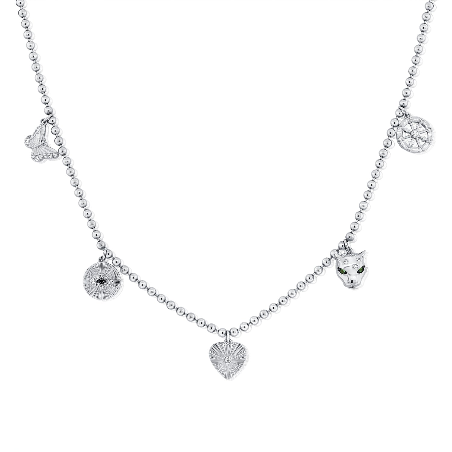 Celebrate your charm with this whimsical 14K Gold Diamond Butterfly Charm Necklace, featuring 0.13 carats of diamonds and playful symbols like a butterfly, panther, heart, compass, and evil eye. Strung on an 18-inch beaded chain, it's a fun yet elegant piece in rose, yellow, or white gold.