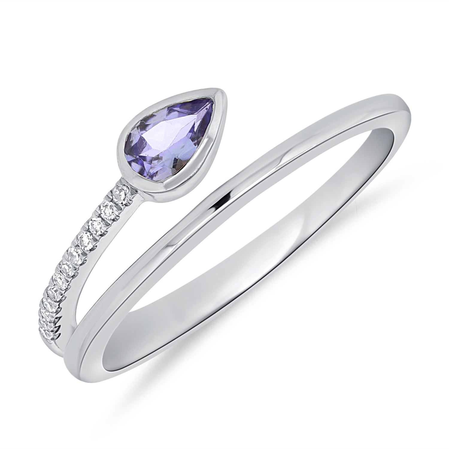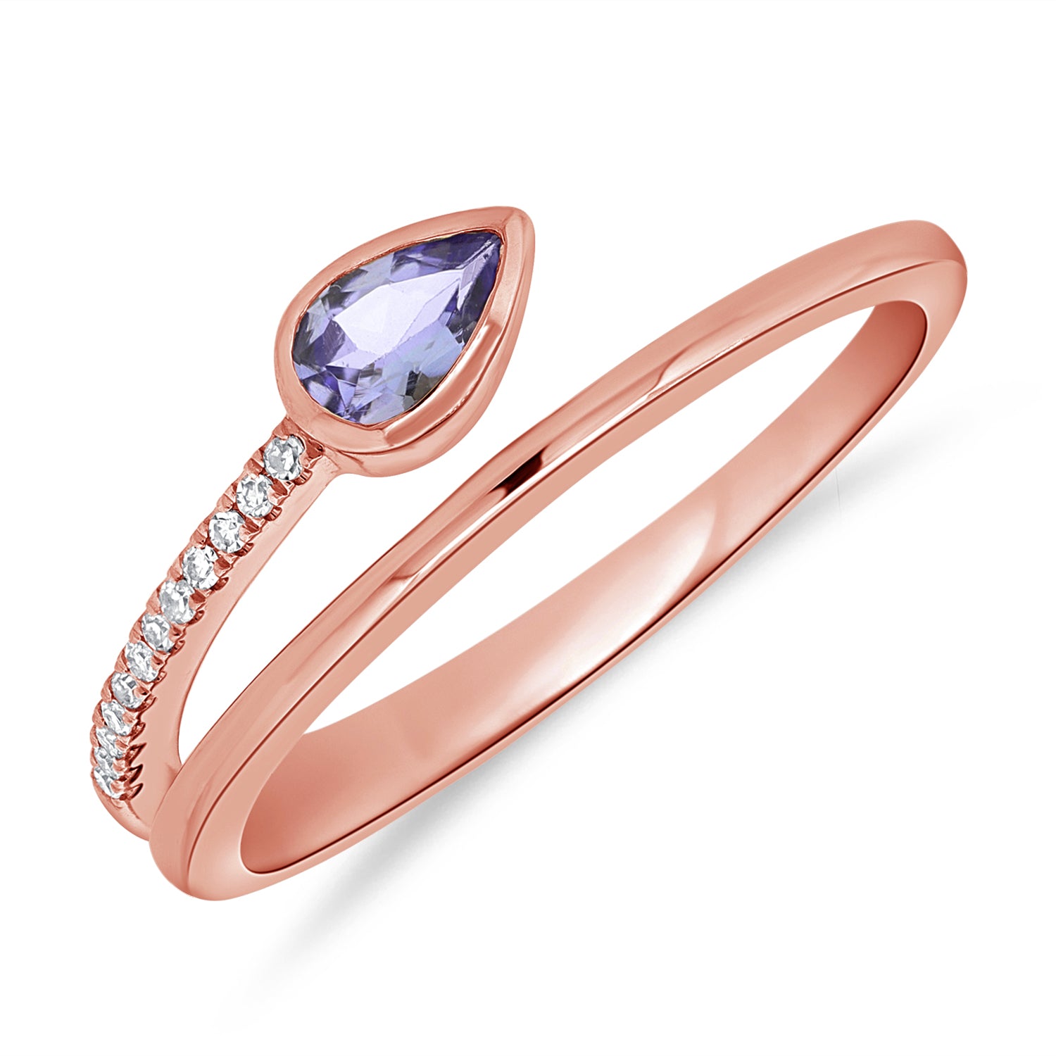 Add a graceful pop of color to your collection with this 0.27 carat pear-shaped tanzanite and diamond ring, beautifully crafted in 14K white, yellow, or rose gold. A vibrant pear-cut tanzanite sits in a sleek bezel setting, complemented by round diamond accents for a touch of refined sparkle.