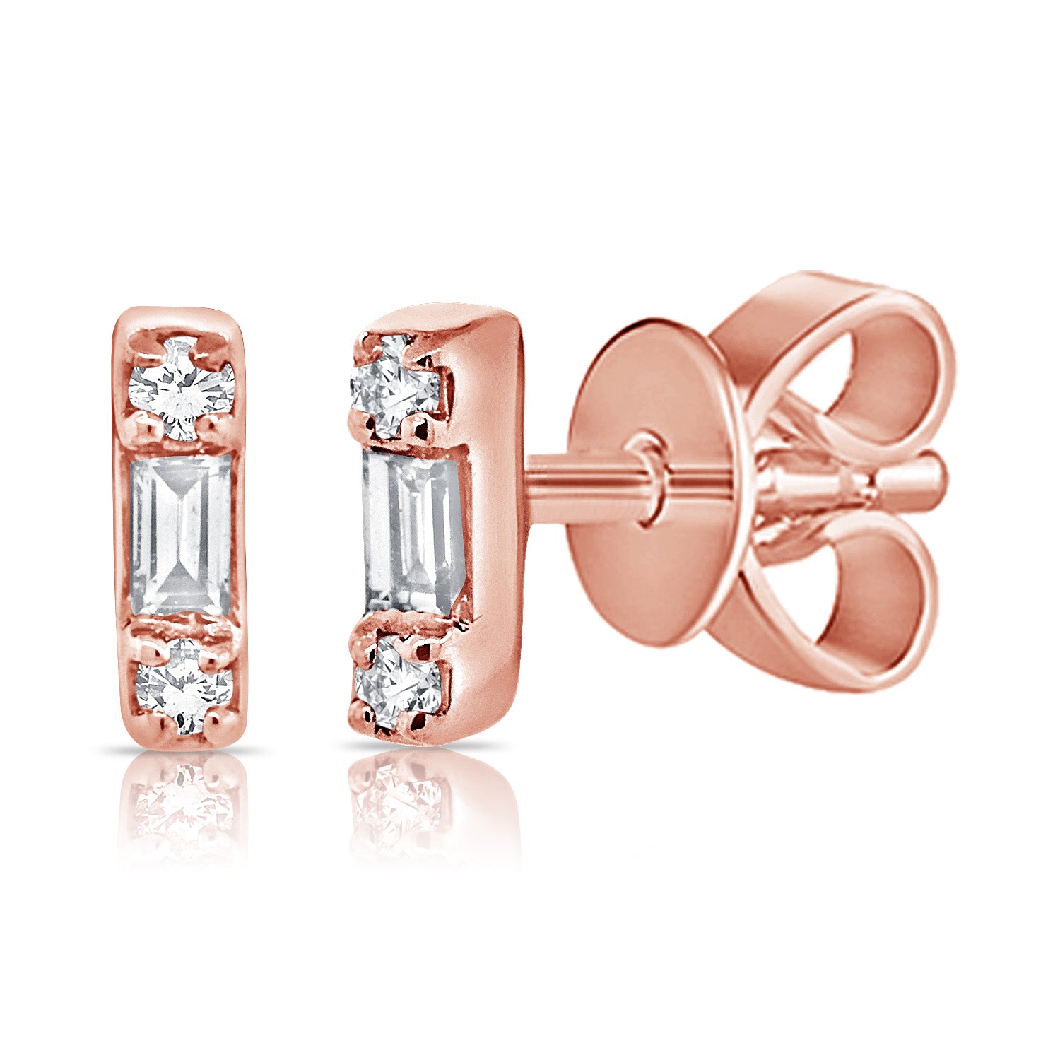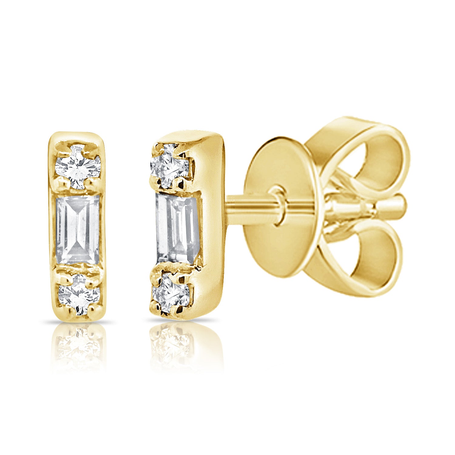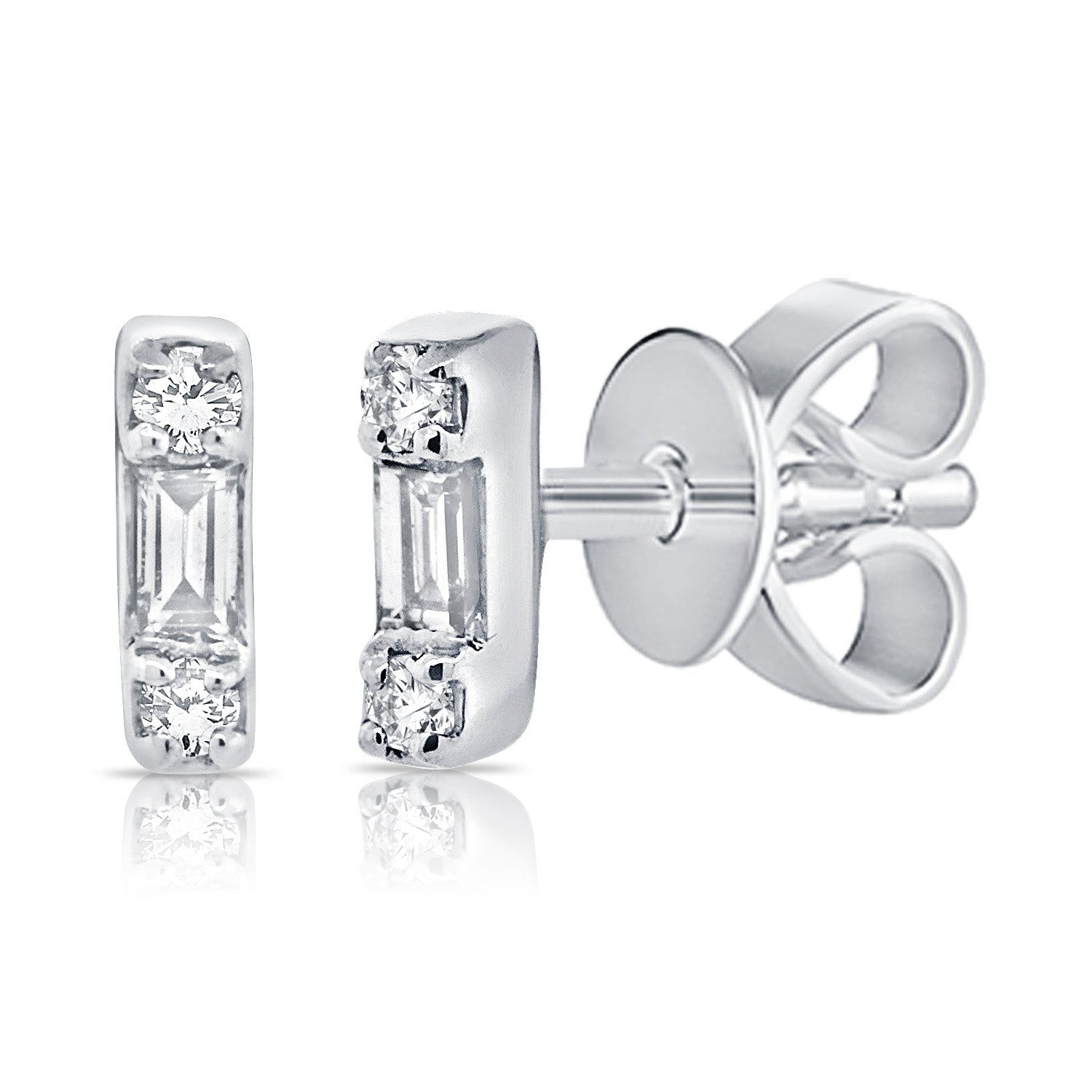 The OKG Collection Round & Baguette Diamond Stud Earrings bring a modern twist to a timeless design. Handcrafted in 14K White Gold, yellow, or rose gold, these earrings feature 0.04 carats of handset round brilliant and baguette-cut diamonds, creating a dynamic sparkle with every movement.