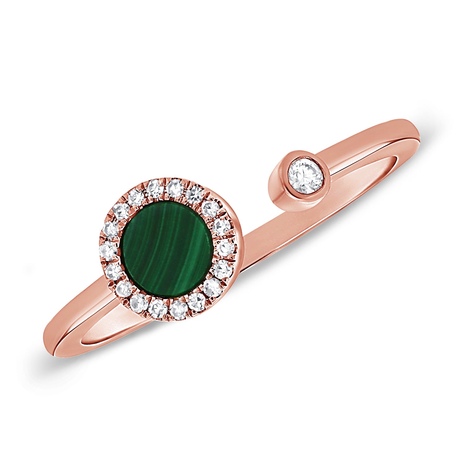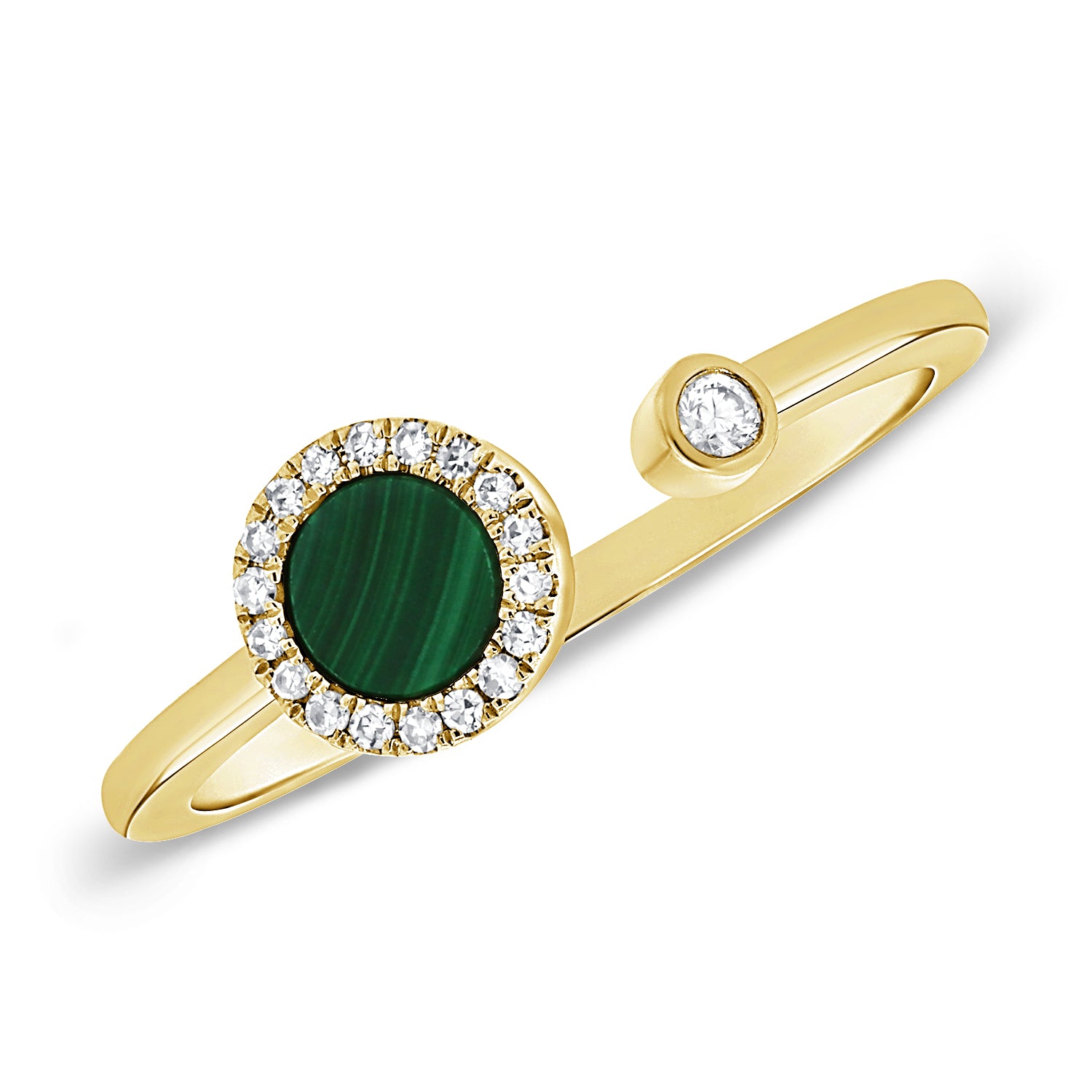 A perfect fusion of color and brilliance, this 0.38-carat Malachite and Diamond Circle Wrap Ring exudes modern elegance. Featuring a round malachite gemstone framed by pavé-set diamonds and a bezel-set diamond accent, this open wrap design adds a refined pop of green to your fine jewelry collection. Available in 14K white, yellow, or rose gold.