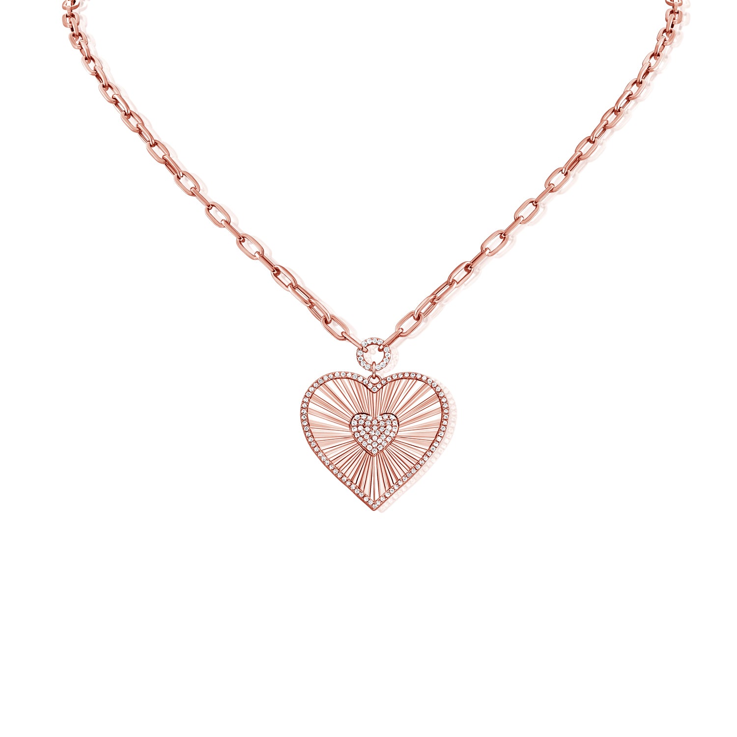 A delicate halo of pavé-set diamonds outlines the heart-shaped pendant, adding extra brilliance with every movement. The pendant is paired with a refined 18-inch paperclip link chain, balancing modern sophistication with classic charm.