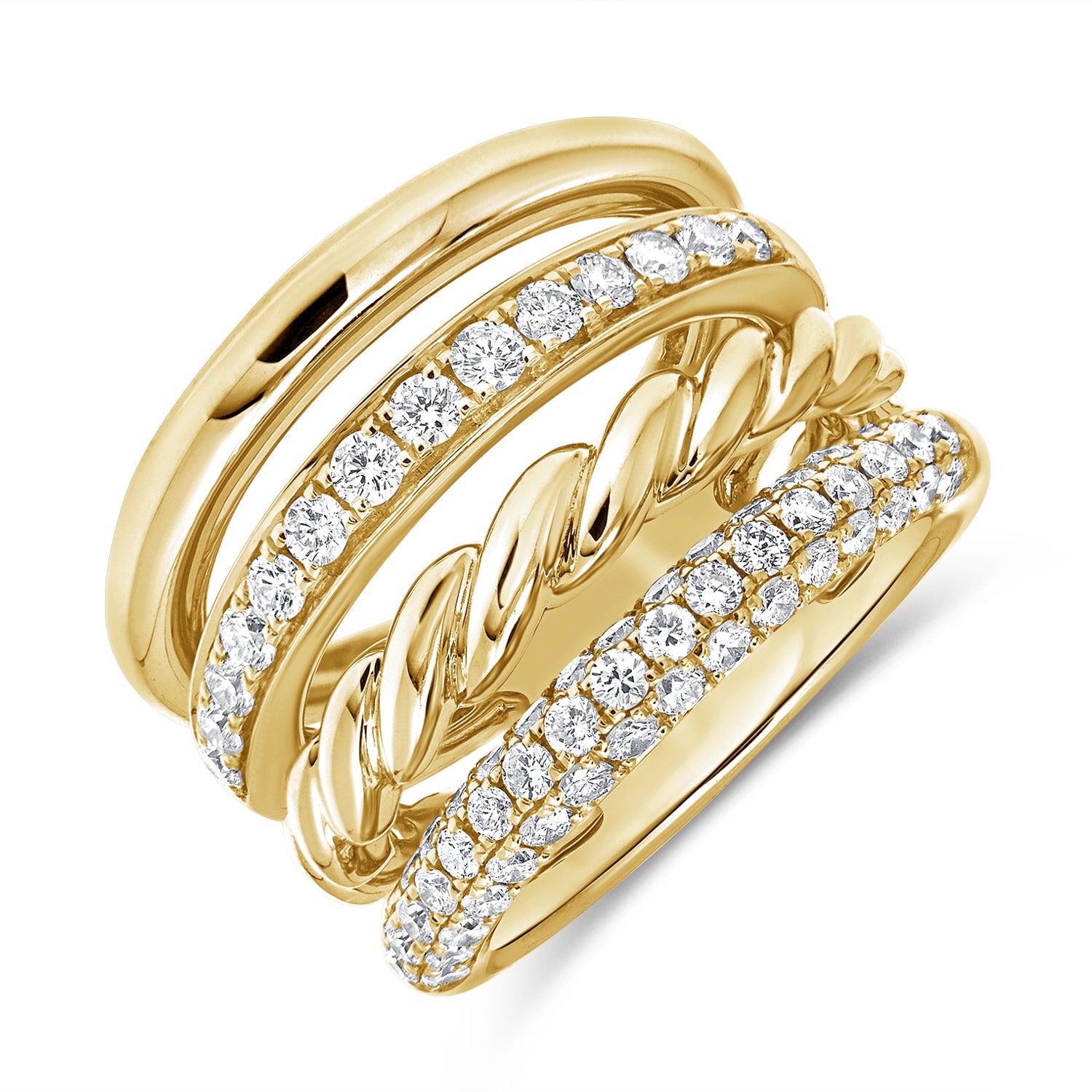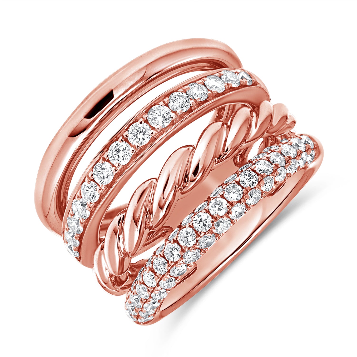 Turn heads with this 1.18 carat diamond cocktail ring in 14K white, yellow, or rose gold. Featuring layered high-polish bands, pavé-set diamonds, and a bold center twist, it’s a modern statement piece perfect for day or night.