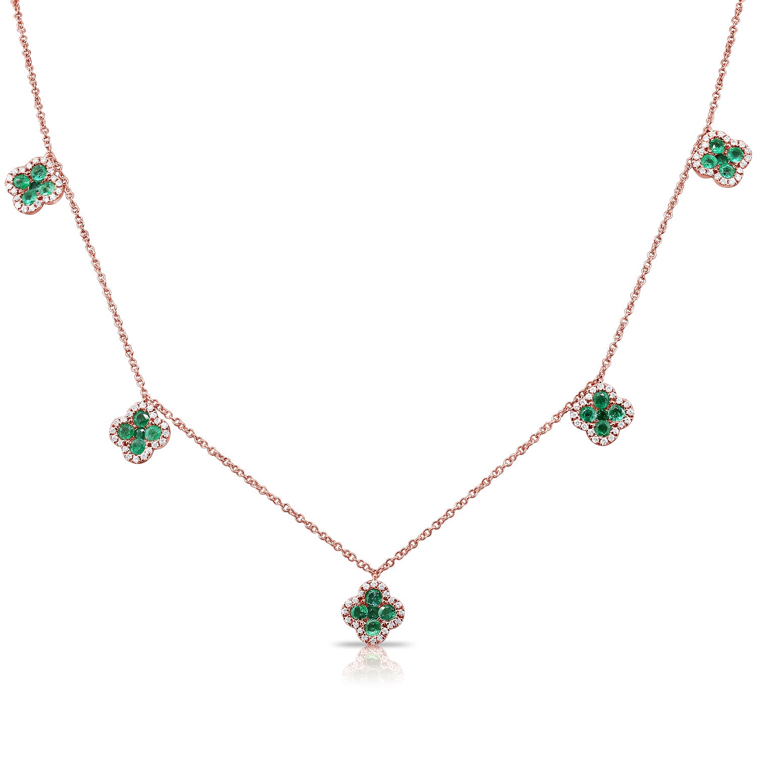 Elevate your style with this 1.75 carat emerald and diamond clover necklace, crafted in 14K gold. Six clover-shaped stations sparkle with vivid emeralds and white diamonds, blending timeless charm with modern elegance. Available in rose, white, or yellow gold-perfect layered or solo for any occasion.