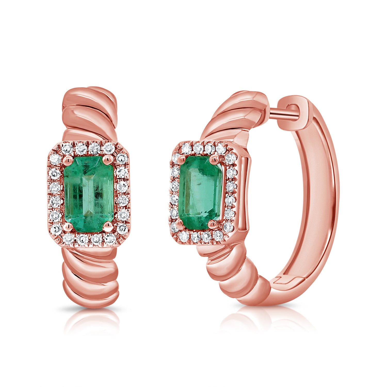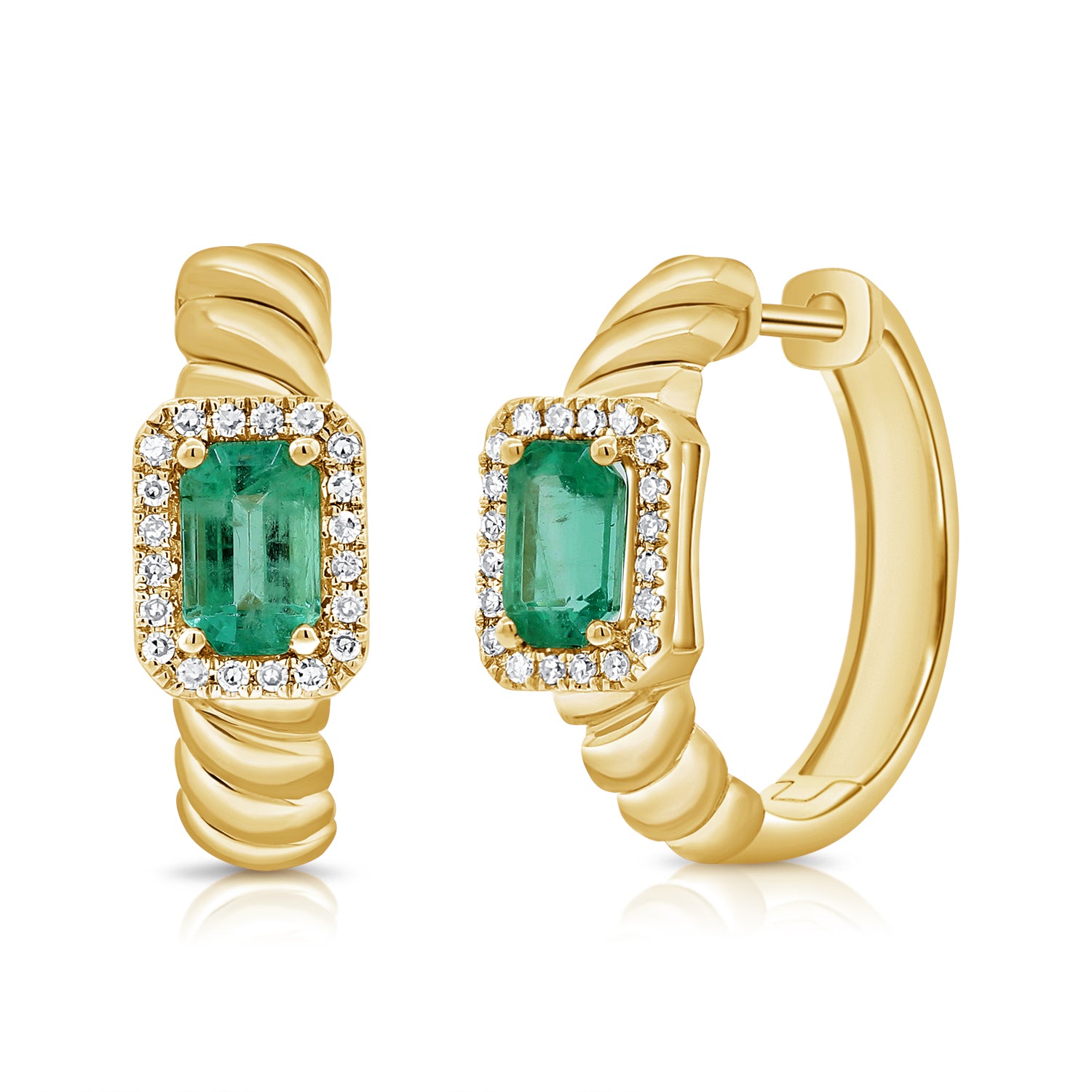 These 14K gold emerald and diamond huggie earrings feature vibrant emeralds totaling 1.28 carats, accented by a halo of sparkling diamonds for a refined, elegant look. Set in classic huggie hoops, they offer a timeless blend of color and brilliance perfect for both everyday wear and special occasions. Available in 14K white, yellow, or rose gold.