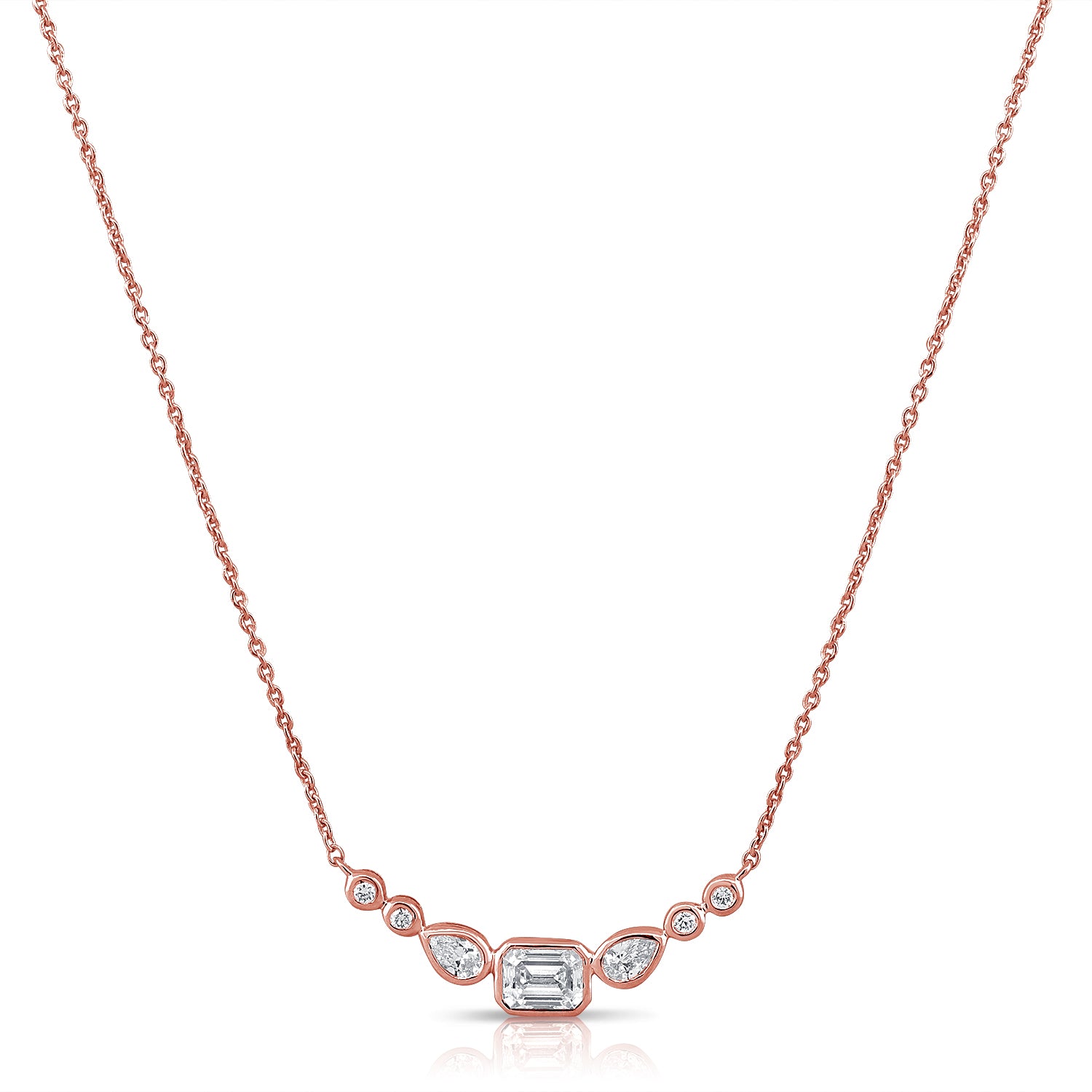 This 0.55ct Diamond Bezel Station Necklace showcases a stunning emerald-cut center diamond accented by pear and round diamonds, all bezel-set in 14K gold. A modern, elegant necklace designed for everyday luxury.