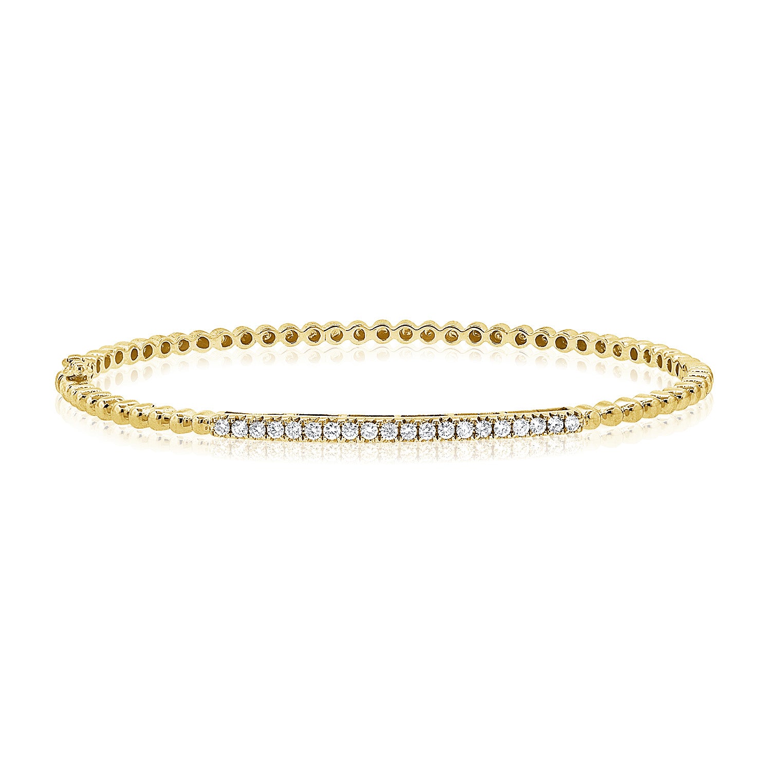 Elevate your elegance with this 14K Gold Beaded Diamond Bangle Bracelet. Featuring a delicate row of dazzling diamonds totaling 0.30 carats, this bangle exudes timeless sophistication. The beaded design adds a modern twist, offering both texture and brilliance in every angle. Available in your choice of 14K white, yellow, or rose gold, it effortlessly complements any style. Whether worn solo for a refined look or stacked for added glamour, this bracelet is the perfect finishing touch to any ensemble.