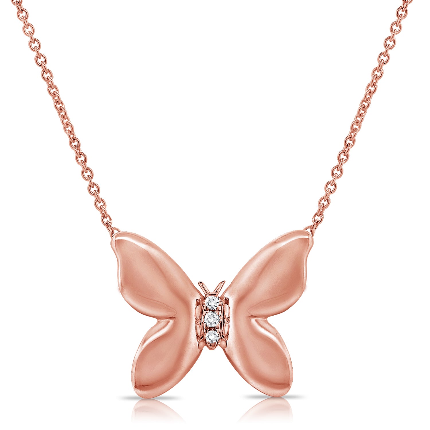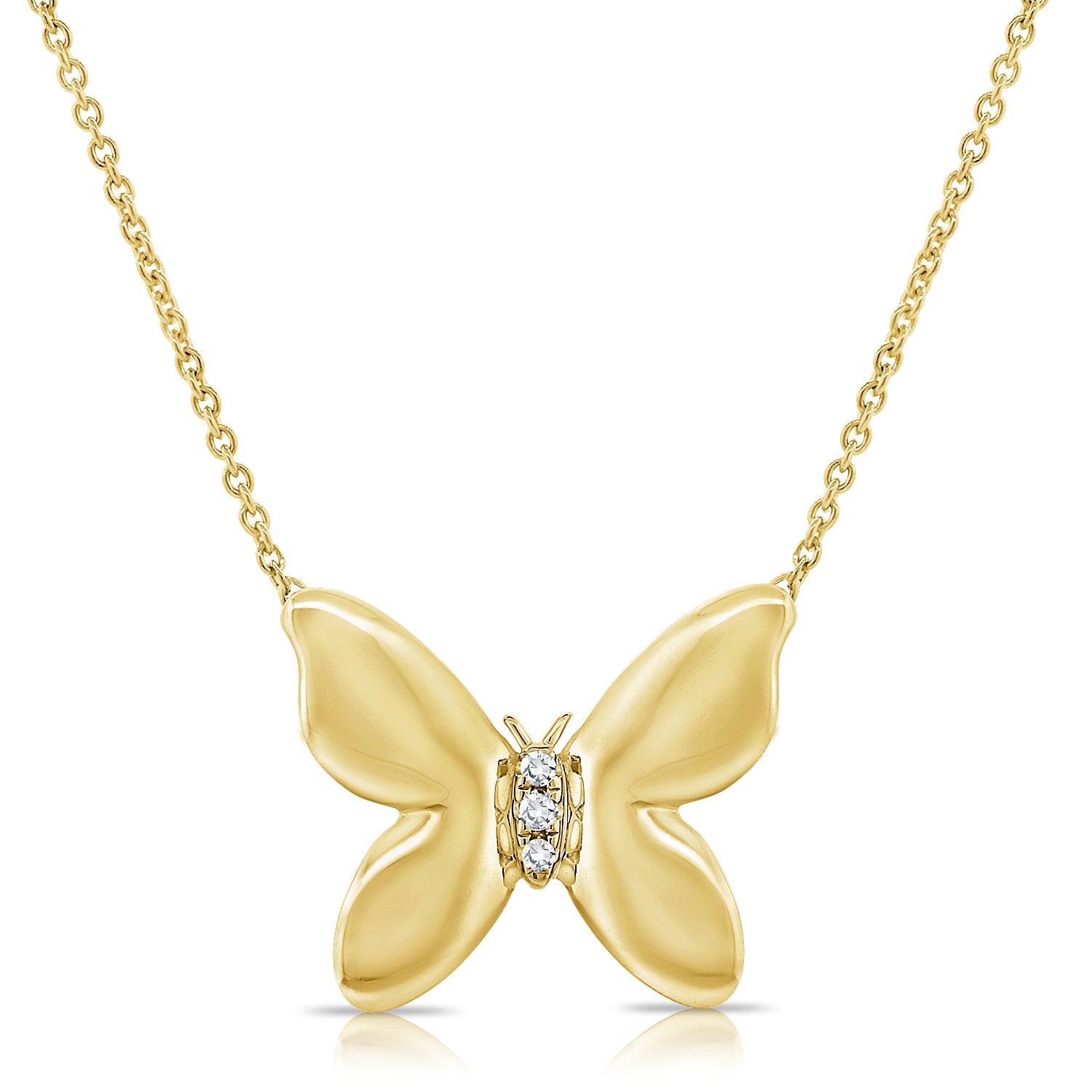 Delight in the delicate charm of the 14K Gold Butterfly Pendant Necklace. Crafted from radiant 14K gold, this enchanting piece features a beautifully detailed butterfly pendant, symbolizing transformation and grace. Adorning the wings of the butterfly are glistening diamonds totaling 0.02 carats, adding a subtle sparkle that captures the light with every movement. This necklace is the perfect blend of elegance and whimsy, making it an ideal accessory for both everyday wear and special occasions. Embrace the beauty of nature with this exquisite butterfly pendant necklace, a timeless addition to any jewelry collection.