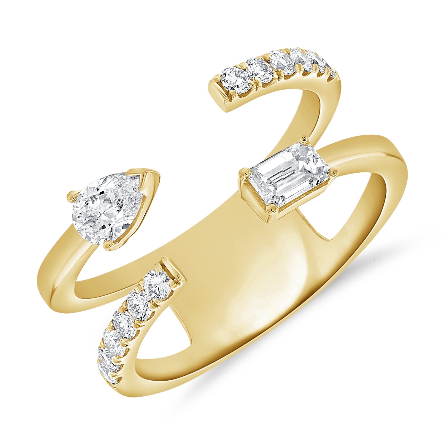 Bold meets refined in this 14K Gold Diamond Wrap Ring, showcasing 0.59 carats of mixed-cut brilliance. A pear-shaped diamond on one end, an emerald-cut on the other, and round pavé accents create a dynamic open silhouette.