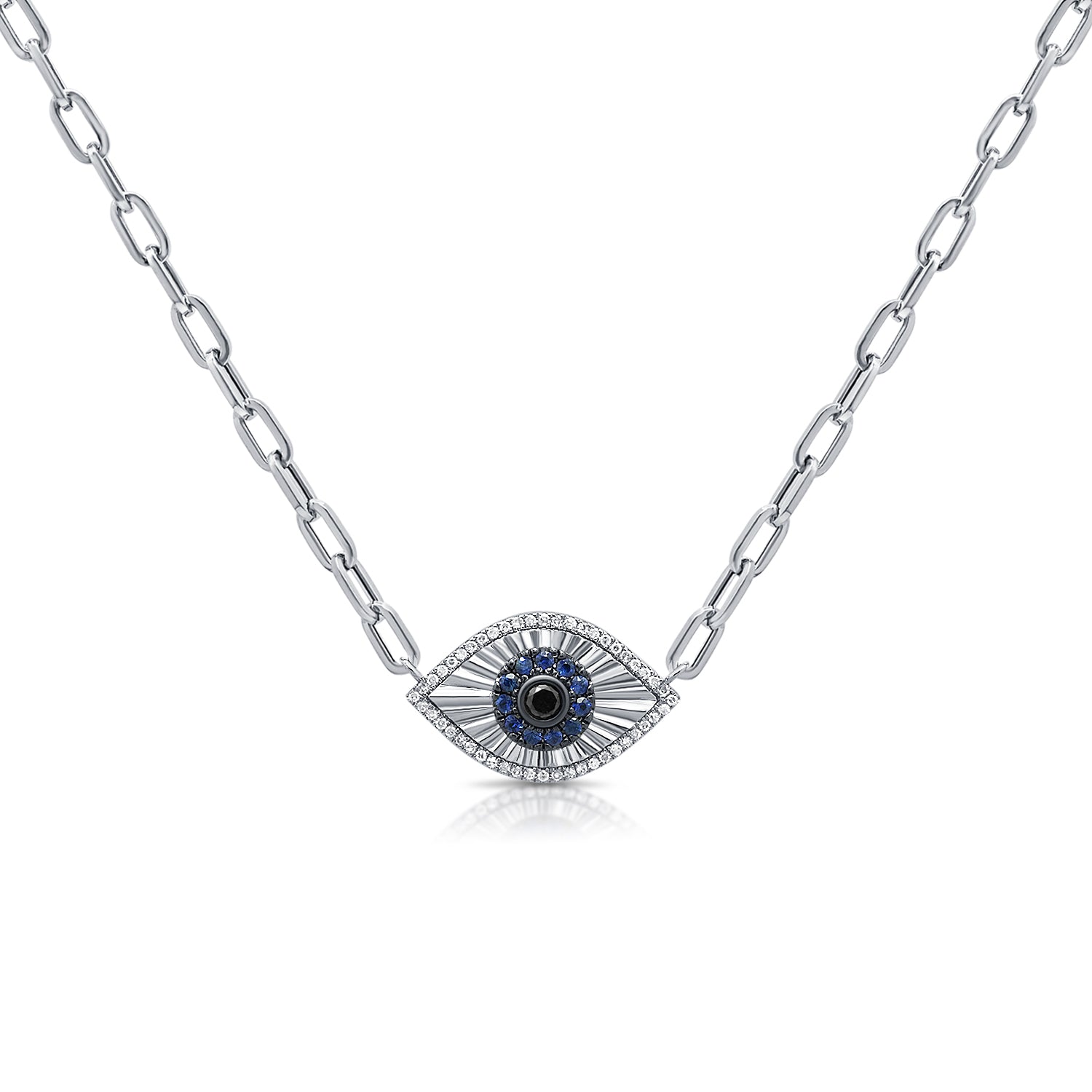 Embrace protection and elegance with this 14K Gold Evil Eye Necklace, featuring 0.37 carats of dazzling diamonds and vivid blue sapphires. Crafted in your choice of white, yellow, or rose gold, the intricate evil eye pendant (12.23mm x 1.95mm) is suspended from a sleek 17" paperclip chain and weighs 4.2 grams.