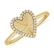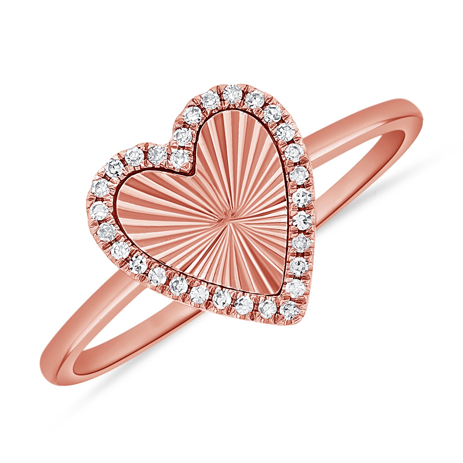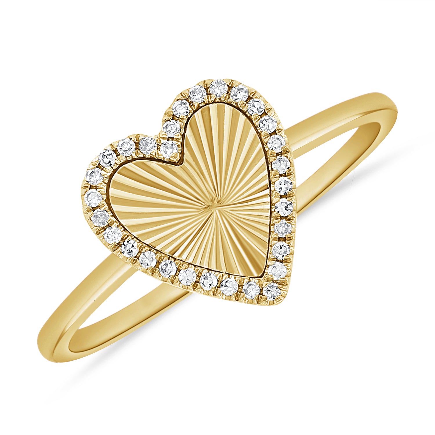 Radiate elegance and charm with the 14K Gold Fluted Heart Ring, adorned with sparkling diamonds totaling 0.09 carats. This beautifully designed ring features a fluted heart motif, adding texture and depth to its timeless silhouette. Delicate diamonds accent the heart, creating a captivating contrast that shines with sophistication. Available in 14K white, yellow, or rose gold, this ring offers versatile styling options for both casual and formal occasions. A symbol of love and beauty, the fluted heart ring is the perfect piece to express your unique style or to gift to someone special.