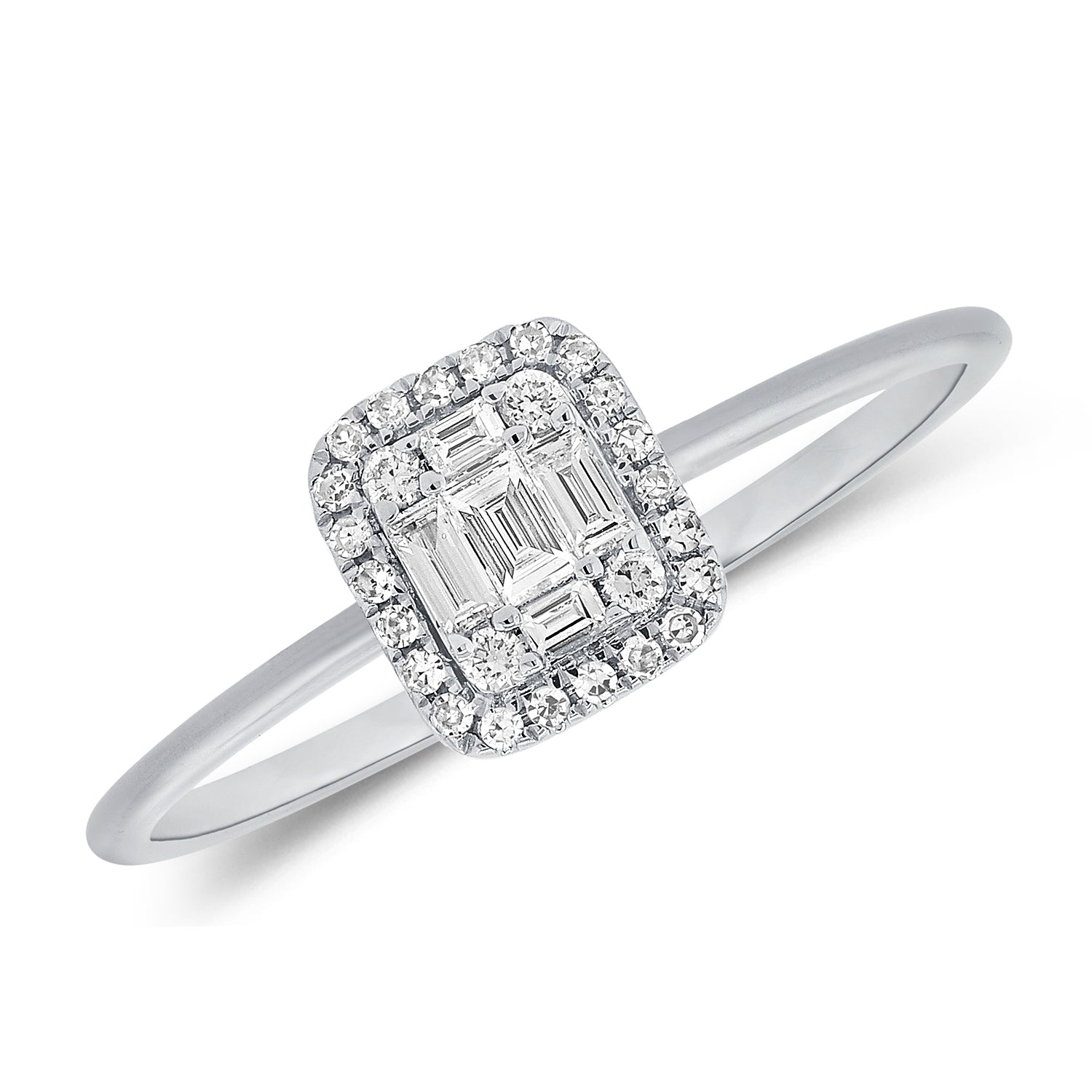 Elevate your style with this 14K Gold Illusion Set Diamond Ring, showcasing 0.21 carats of baguette and round diamonds in a geometric halo that creates the look of a larger center stone. Available in 14K white, yellow, or rose gold, this elegant ring is perfect as a delicate engagement ring, promise ring, or a timeless everyday statement.