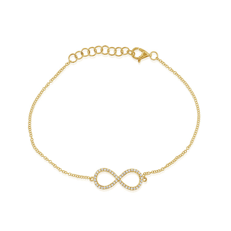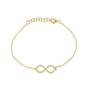 Symbolize your eternal elegance with the 14K Gold Infinity Bracelet. This sophisticated piece showcases a graceful infinity symbol, encrusted with dazzling diamonds totaling 0.12 carats. Each diamond is expertly set to maximize brilliance, creating a captivating sparkle that complements the timeless allure of the 14K gold chain. Perfect for daily wear or special occasions, this bracelet adds a touch of luxury and meaning to any ensemble. Celebrate everlasting style and exceptional craftsmanship with this exquisite infinity bracelet, a must-have for any jewelry collection.