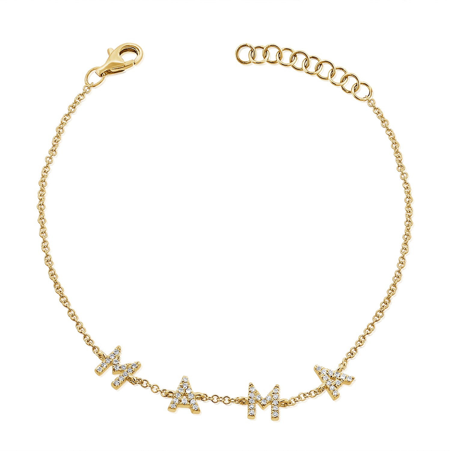 Celebrate the special bond with the 14K Gold "Mama" Diamond Bracelet, a heartfelt tribute to the one who means everything. This elegant bracelet features the word "Mama" crafted in gleaming 14K gold and embellished with sparkling diamonds totaling 0.11 carats. The bracelet weighs 1.58 grams. Each diamond is carefully set to enhance its brilliance, creating a stunning contrast against the warm gold. The bracelet's delicate chain adds a touch of sophistication, making it a perfect gift for any occasion. Express your love and appreciation with this beautiful, timeless piece, designed to honor and cherish the special mama in your life.