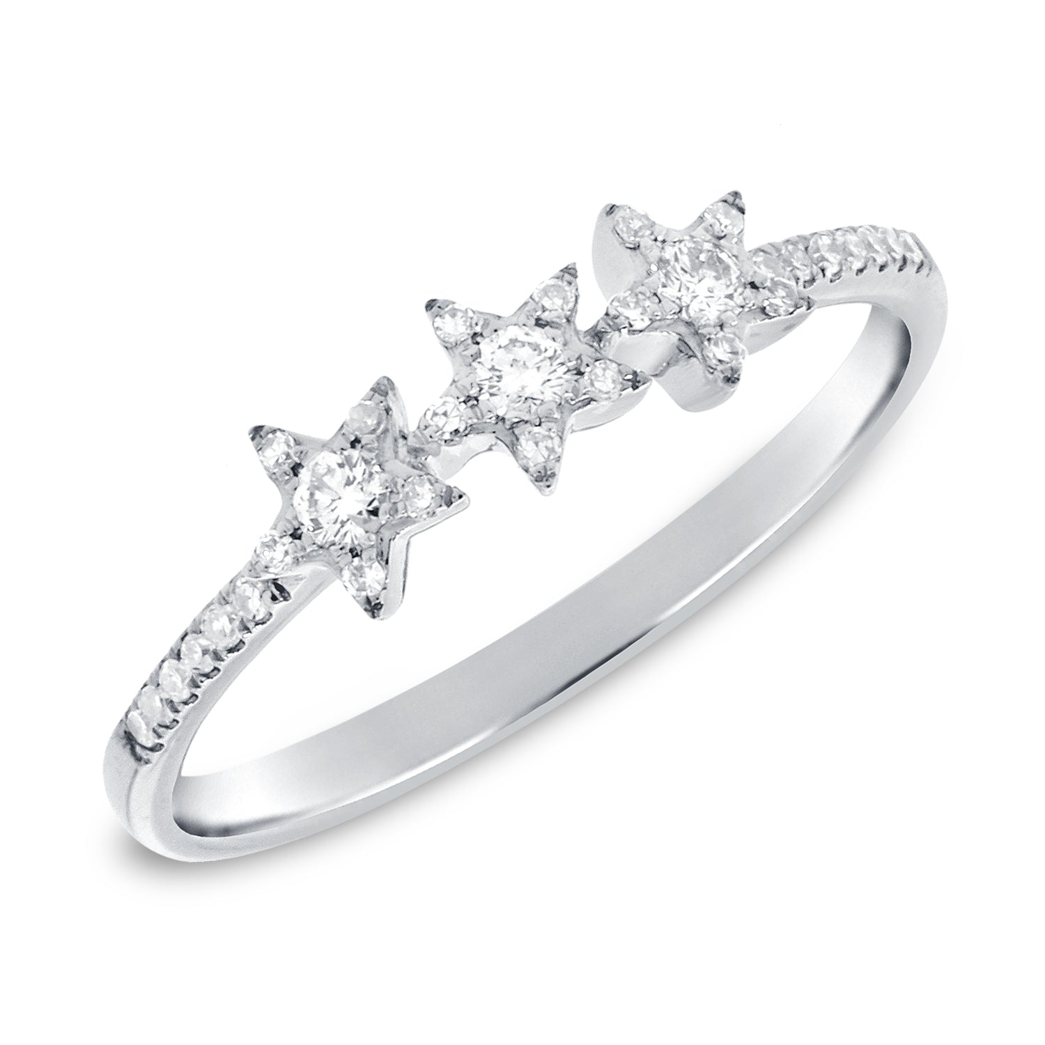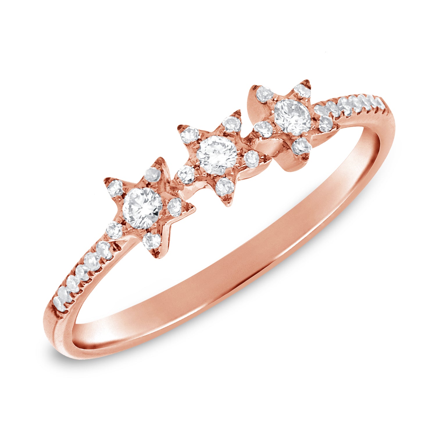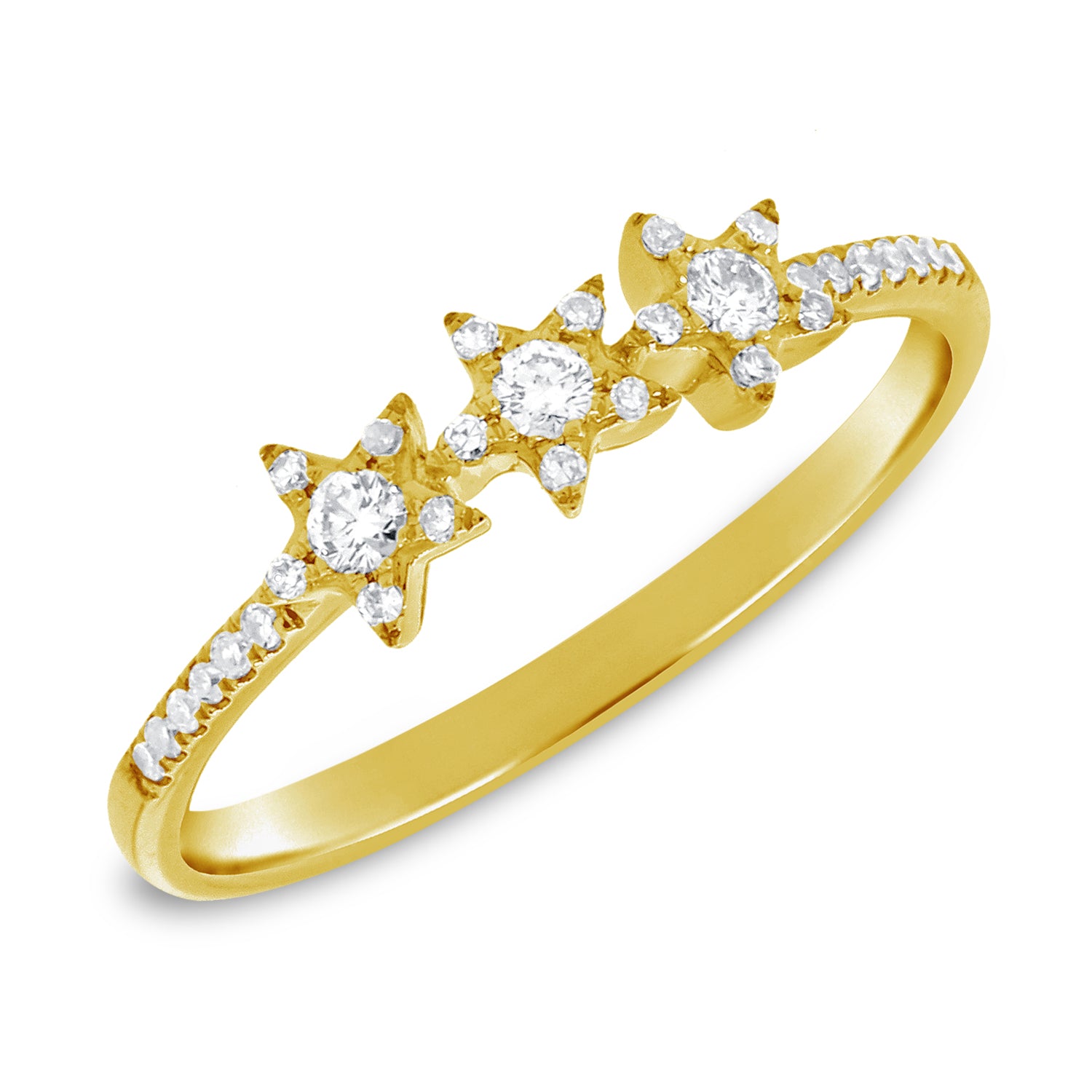 Illuminate your style with the captivating charm of our 14K Gold Tri Star Ring. Available in 14K white, yellow, or rose gold, this stunning ring features three radiant star-shaped settings, each adorned with sparkling diamonds totaling 0.19 carats. The elegant arrangement of stars creates a dazzling effect, symbolizing aspirations and dreams with every glance. The high-quality gold craftsmanship and brilliant diamonds make this ring a perfect accessory for adding a touch of celestial elegance to any ensemble. Ideal for those who love unique and glamorous pieces, this ring will effortlessly enhance your jewelry collection.
