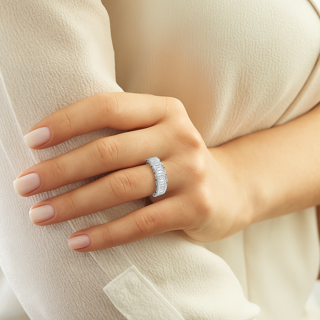 Make a bold and timeless statement with this 7.50 carat emerald cut lab grown diamond eternity band, expertly crafted in 14K white, yellow, or rose gold. Featuring VS clarity, F-G color lab grown diamonds in a classic 5x3mm emerald cut, this eternity band offers sleek sophistication with exceptional sparkle. The elegant four-prong setting enhances each stone’s brilliance, creating a luxurious ring perfect for anniversaries, weddings, or celebrating life’s milestones. A modern heirloom designed for lasting beauty and everyday luxury.