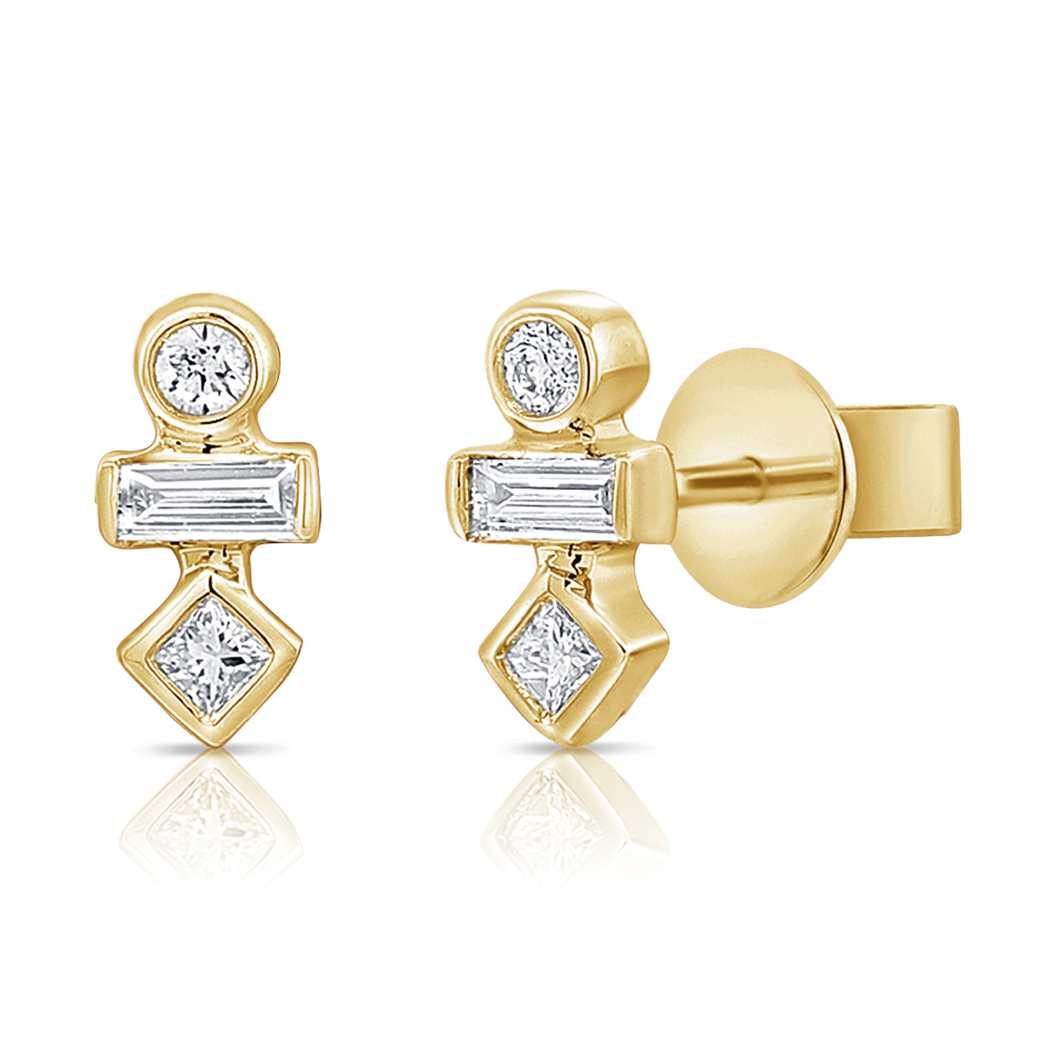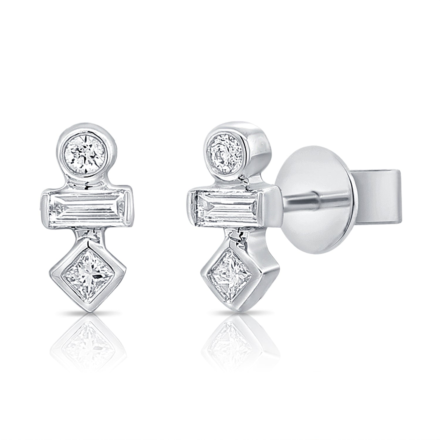 Elevate your everyday elegance with these Geometric Diamond Baguette Stud Earrings, a contemporary masterpiece crafted in 14K white, yellow, or rose gold. Designed with a striking arrangement of round brilliant-cut, baguette, and kite-shaped diamonds, these earrings sparkle with 0.98 carats of natural diamonds, making them the perfect statement for both casual and formal wear.