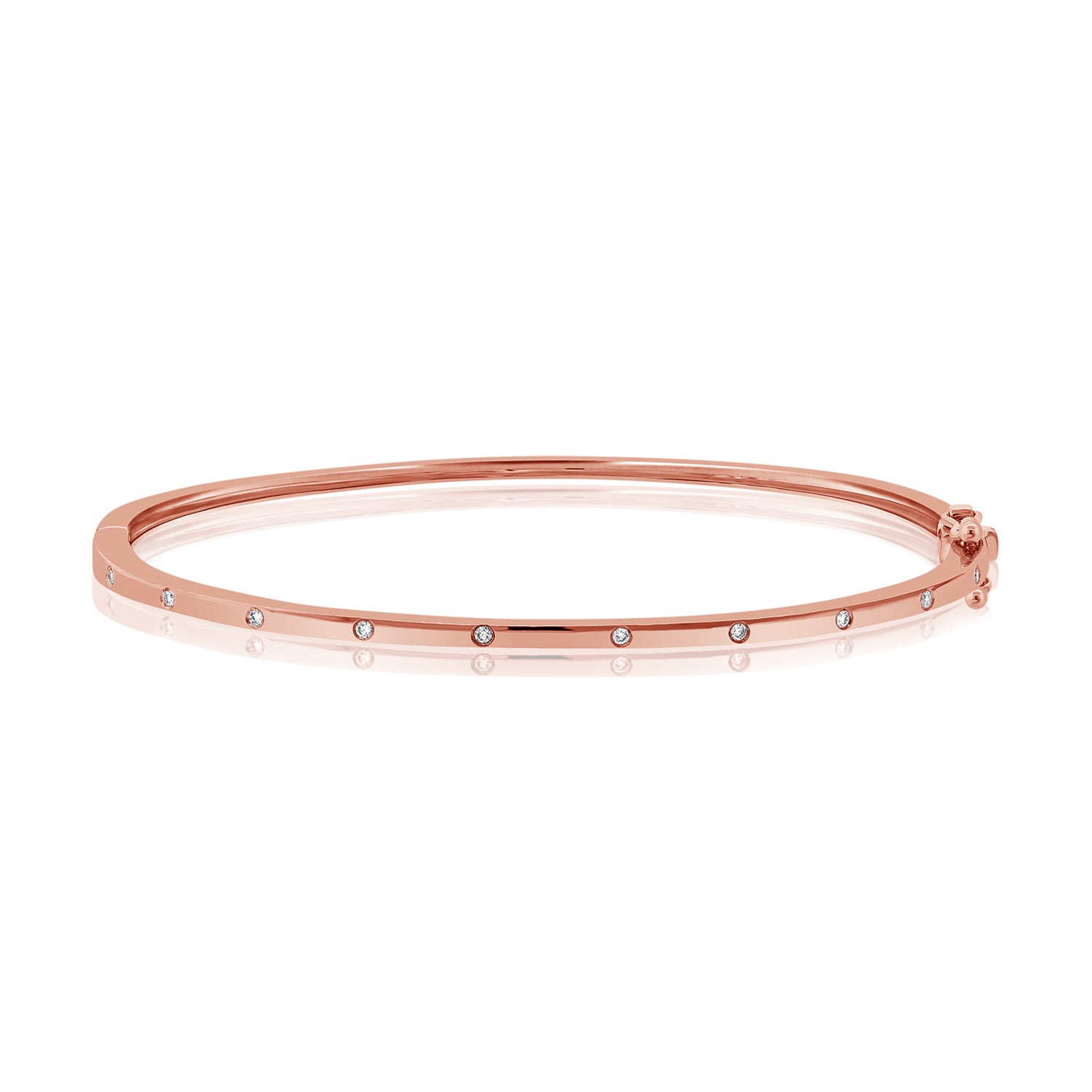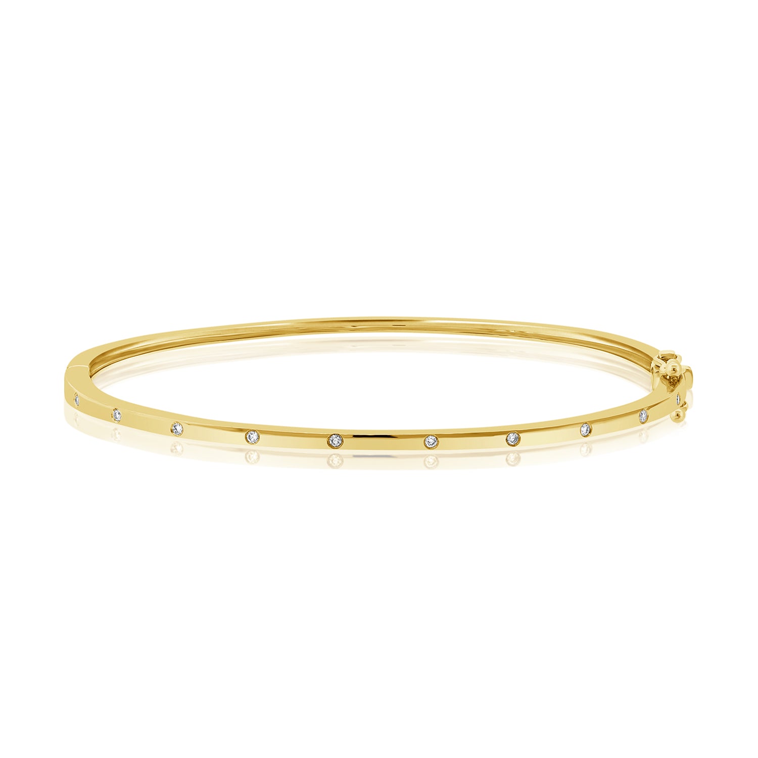 Elegant and refined, this Diamond Dot Bangle Bracelet in 14K Gold brings a touch of sparkle to any look. The bangle weighs 5.65 grams. Measuring 3mm in thickness and 1.96mm in height it features delicate diamonds totaling 0.07 carats spaced evenly around the sleek bangle, adding a subtle hint of glamour while maintaining a minimalist appeal. Perfect for layering or wearing solo, this piece effortlessly elevates both casual and formal styles. Available in 14K white, yellow, or rose gold, this versatile bracelet is a timeless addition to any jewelry collection, ideal for those who appreciate understated luxury.