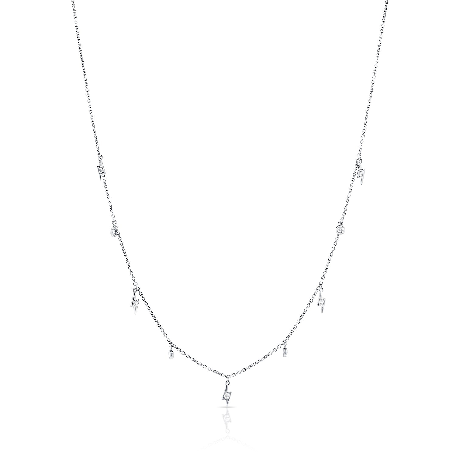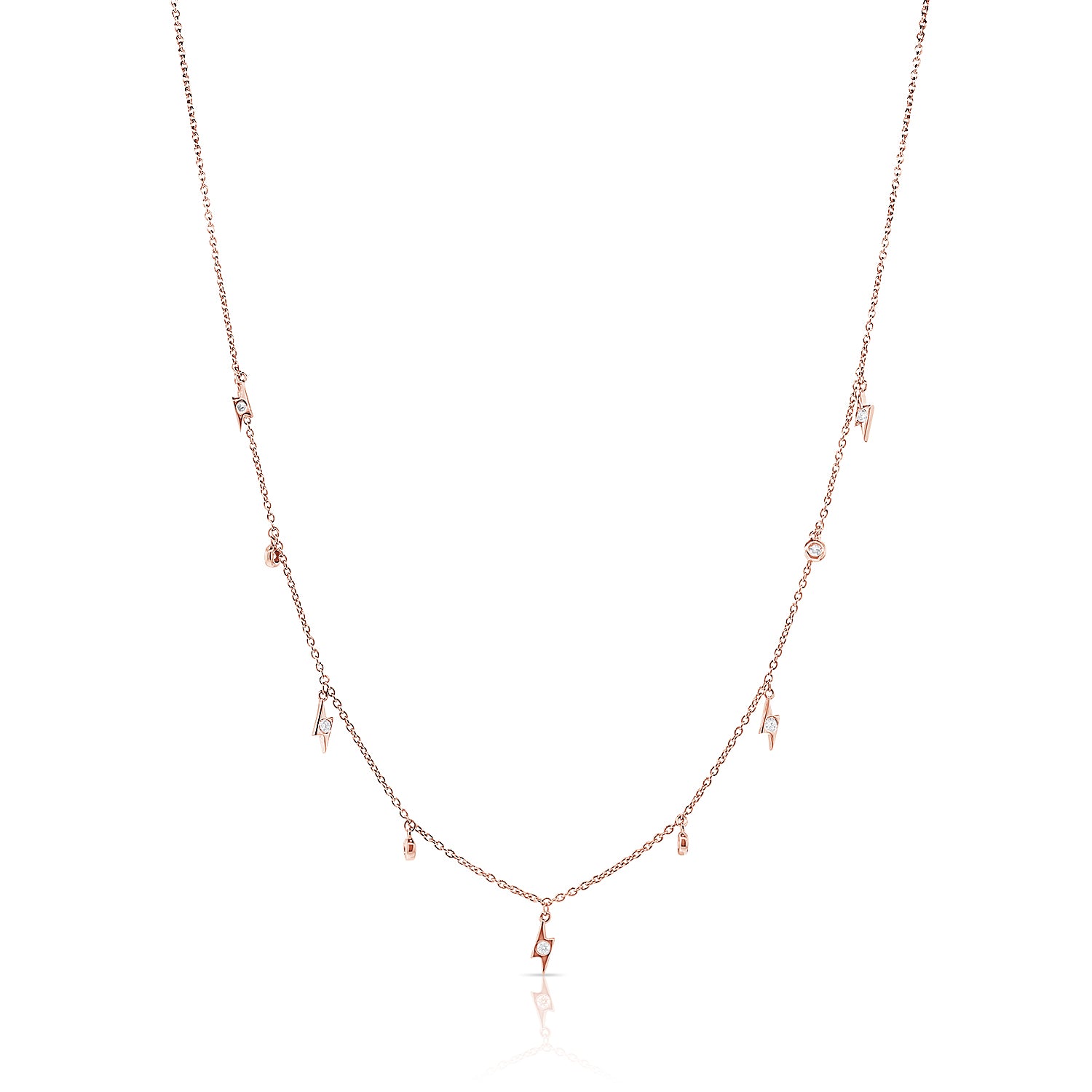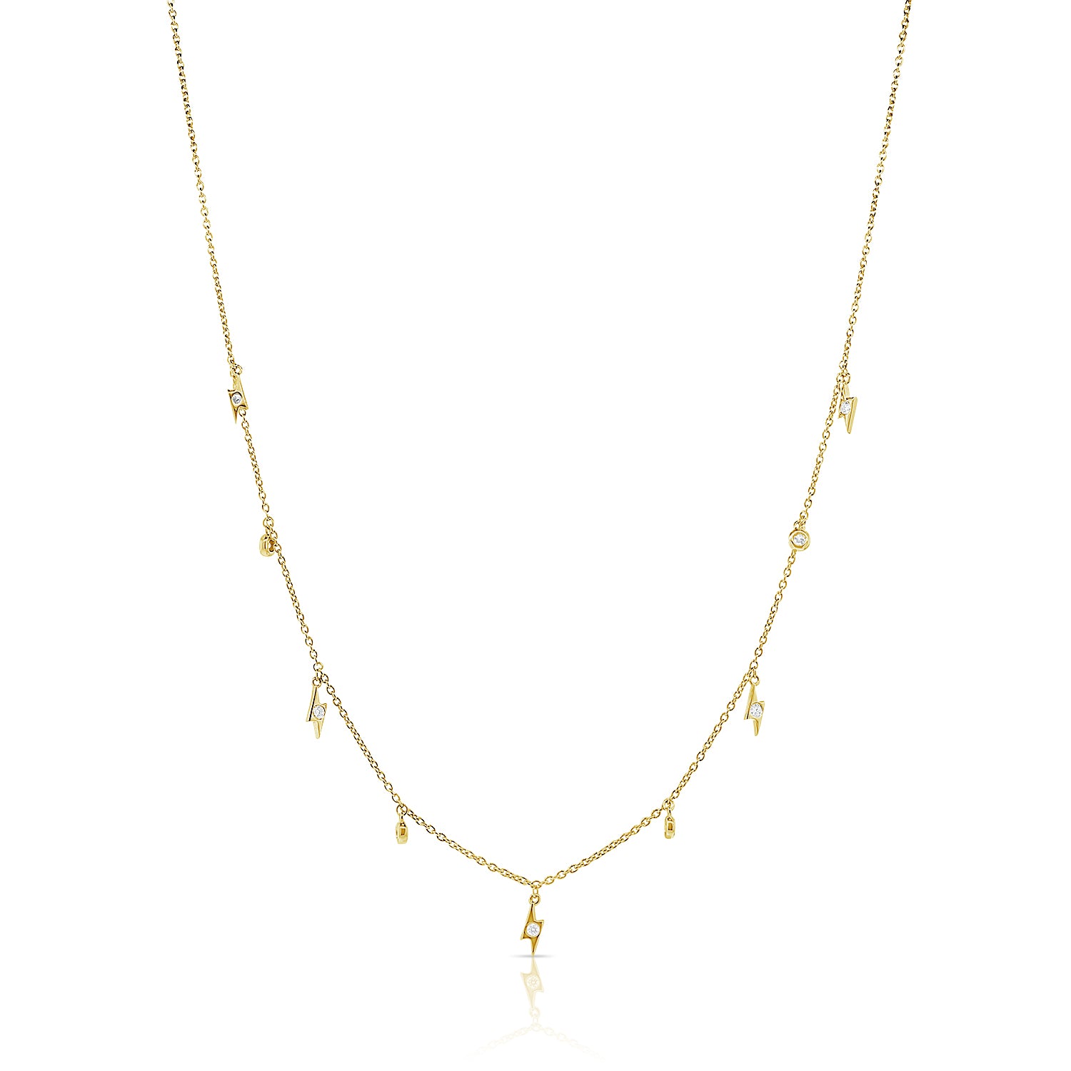 Energize your look with the 14K Gold Diamond Lightning Bolt Station Necklace, a dazzling fusion of bold design and refined elegance. This striking necklace features a series of lightning bolt stations, each crafted from radiant 14K gold and adorned with sparkling diamonds totaling 0.26 carats. The dynamic lightning bolt design captures the eye with its electrifying sparkle and modern edge. Suspended from a sleek gold chain, this necklace effortlessly adds a touch of glamour and sophistication to any outfit. Perfect for making a statement or adding a touch of excitement to your everyday style, this piece is a true testament to contemporary luxury.