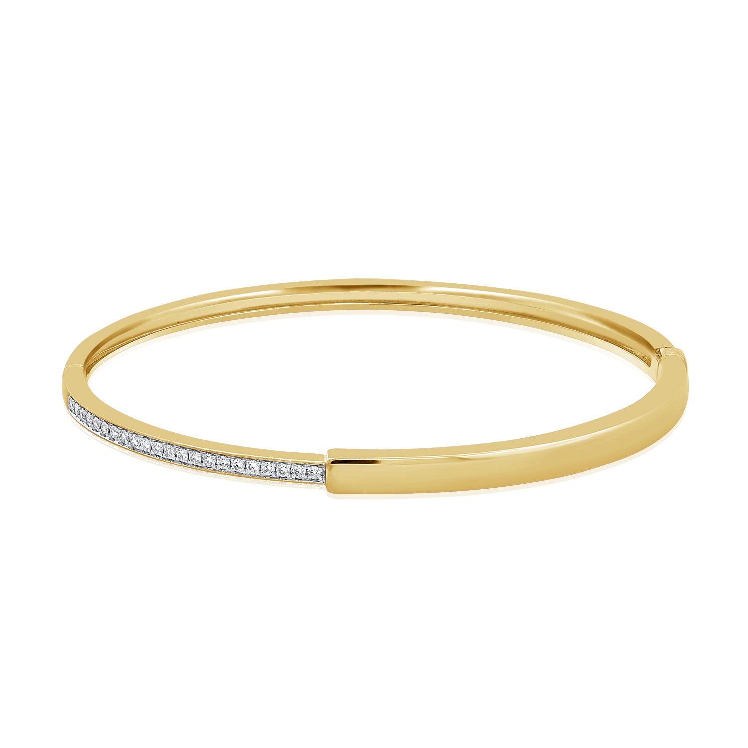 Sleek and refined, this 0.20 carat diamond bangle bracelet in 14K gold features a row of pav-set round diamonds for understated sparkle. Its minimalist design transitions effortlessly from day to night, perfect for stacking or solo wear. Available in 14K rose, white, or yellow gold, with a secure clasp for everyday elegance.