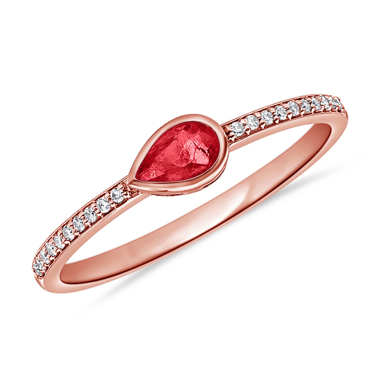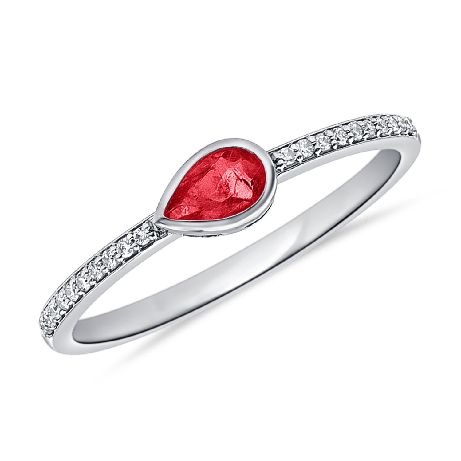 A striking blend of passion and elegance, this Ruby Pear & Diamond Ring showcases a 0.50-carat combination of vivid rubies and sparkling diamonds. The pear-shaped ruby is bezel-set for a sleek, modern look, while a pavé diamond band adds refined brilliance.