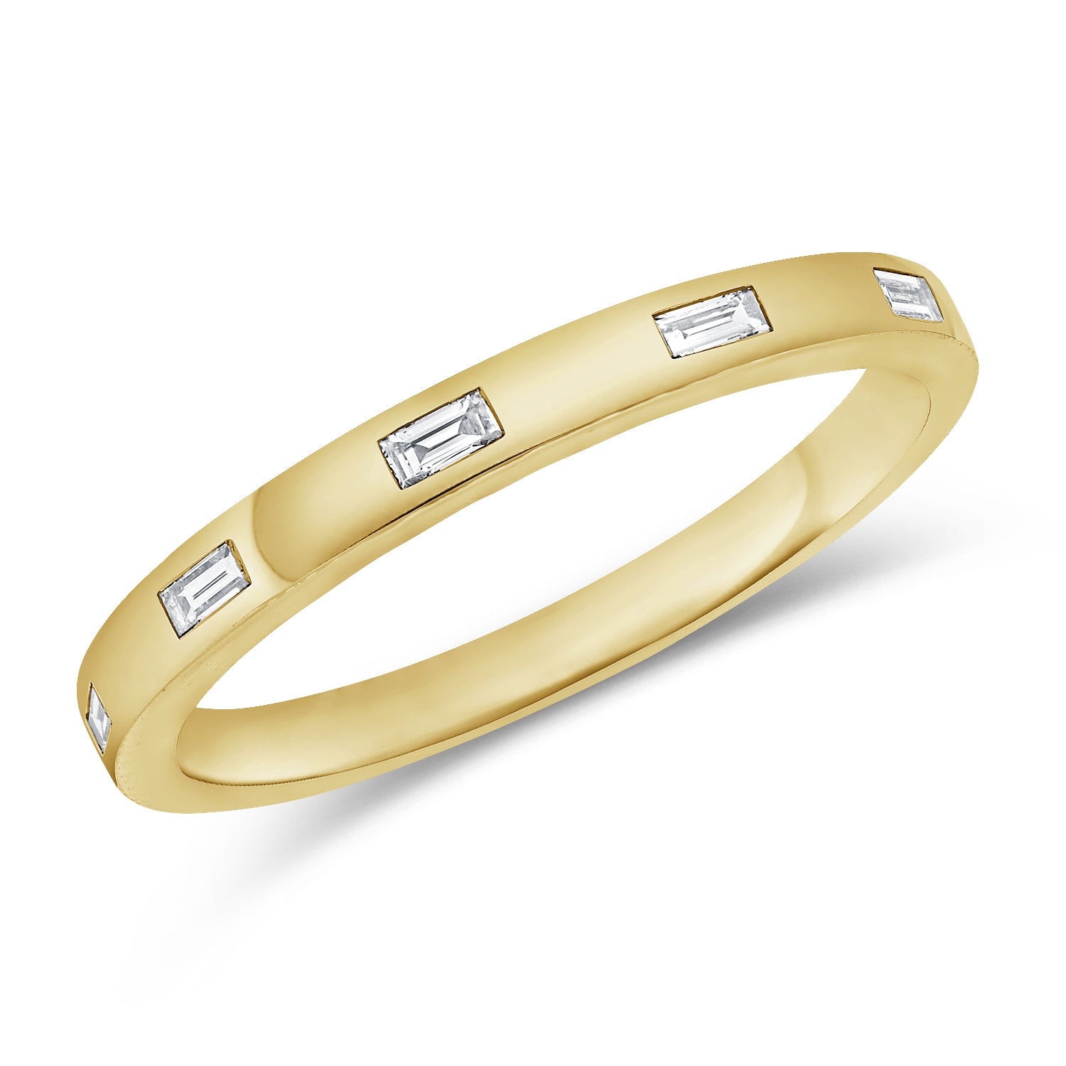 Elevate your style with this 0.09ct Baguette Diamond Bezel-Set Ring, crafted in 14K white, yellow, or rose gold. Featuring sleek bezel-set baguette diamonds, this minimalist band offers modern elegance and subtle sparkle—perfect for stacking or wearing solo. A timeless, refined piece designed for everyday luxury.