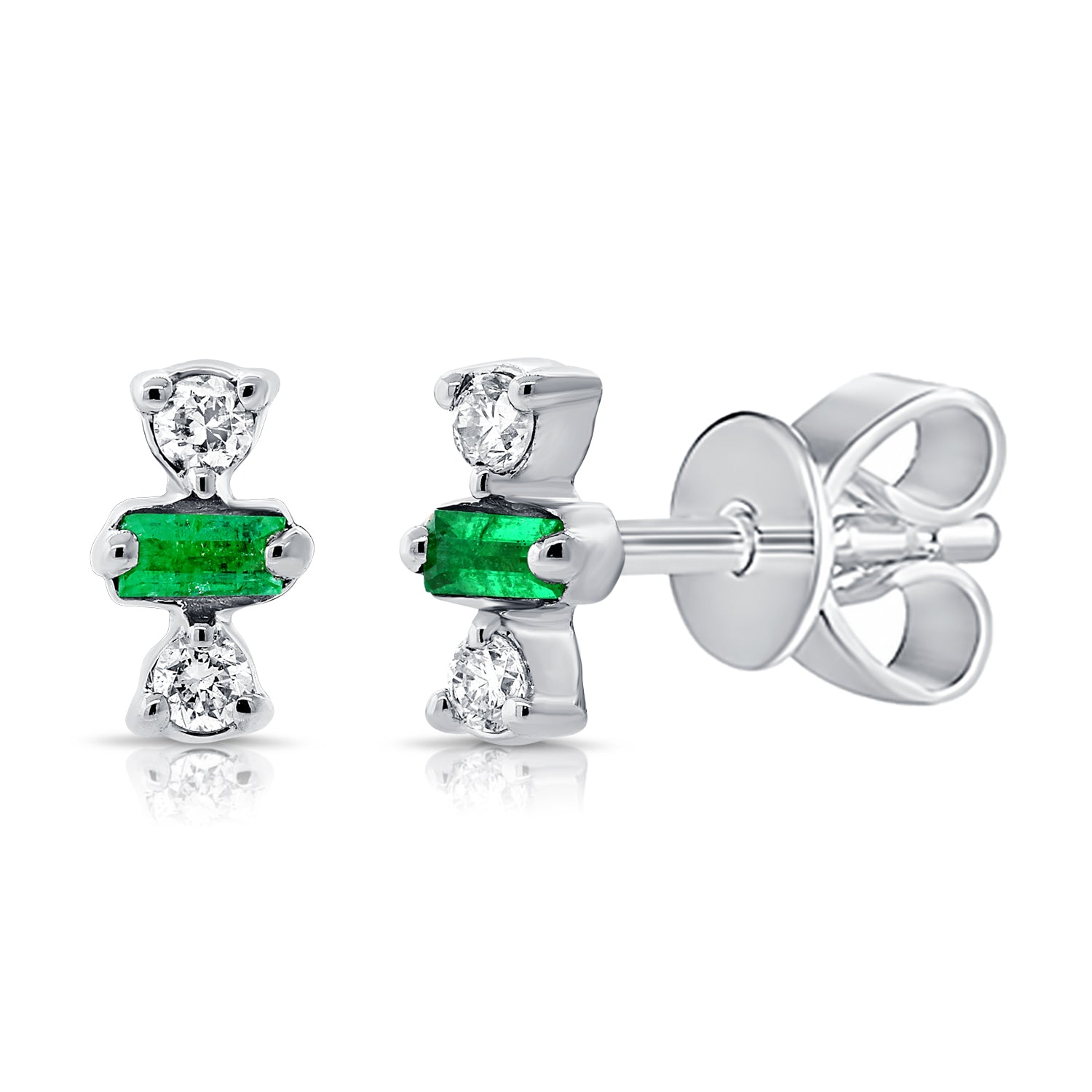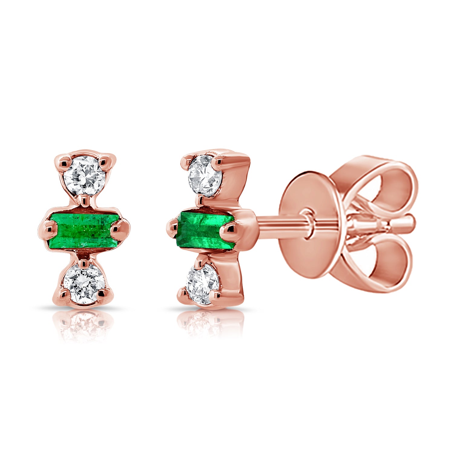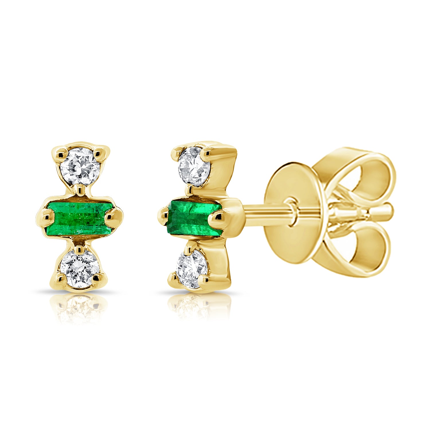 14K Gold Baguette Emerald and Diamond Stud Earrings | 0.13ct Emerald Studs
