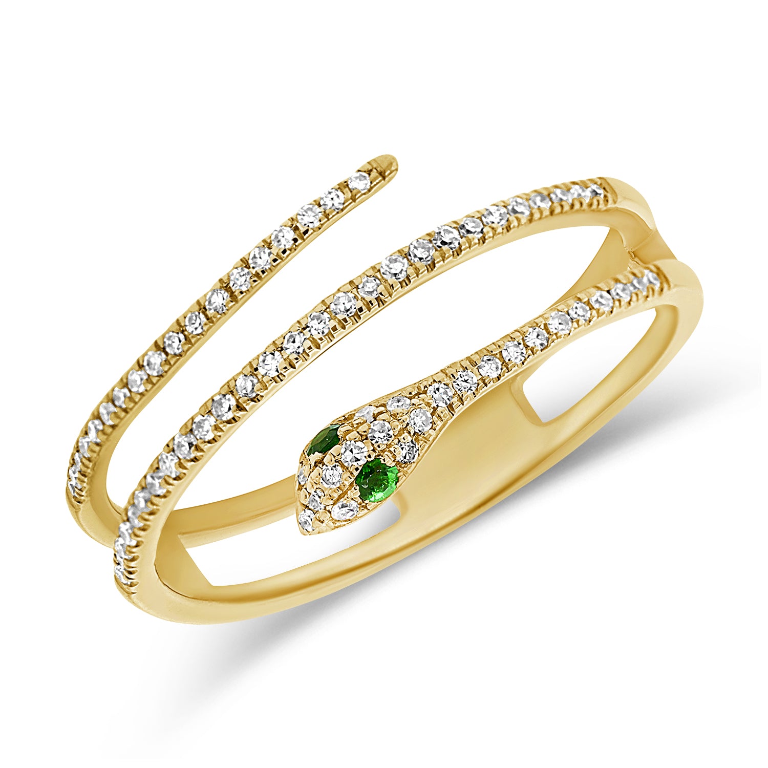 This captivating 0.19-carat Green Tsavorite and Diamond Snake Wrap Ring embodies bold elegance and symbolism. Designed in the shape of a coiled serpent, it features brilliant round-cut diamonds with vivid green tsavorite gemstone eyes — a stunning balance of luxury and allure, handcrafted in 14K gold.
