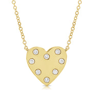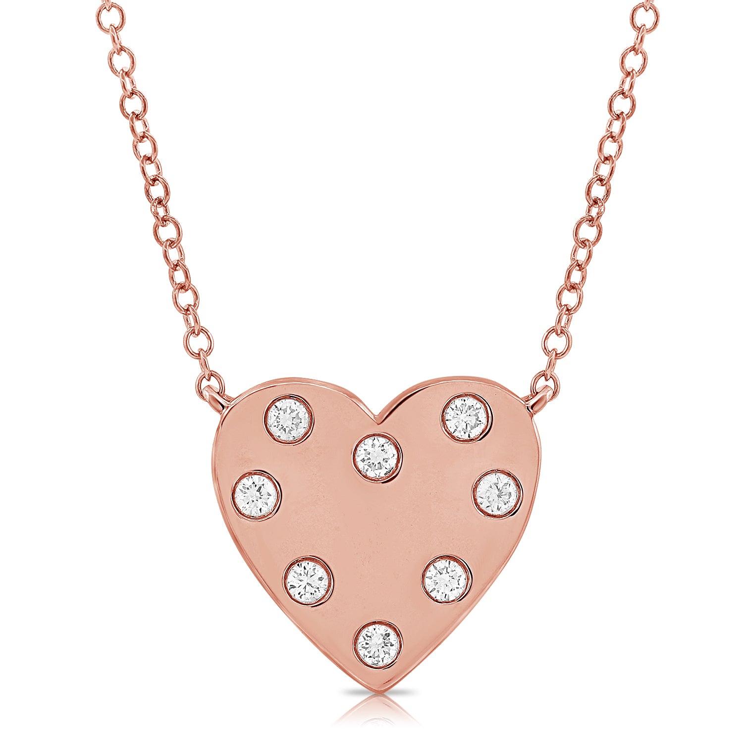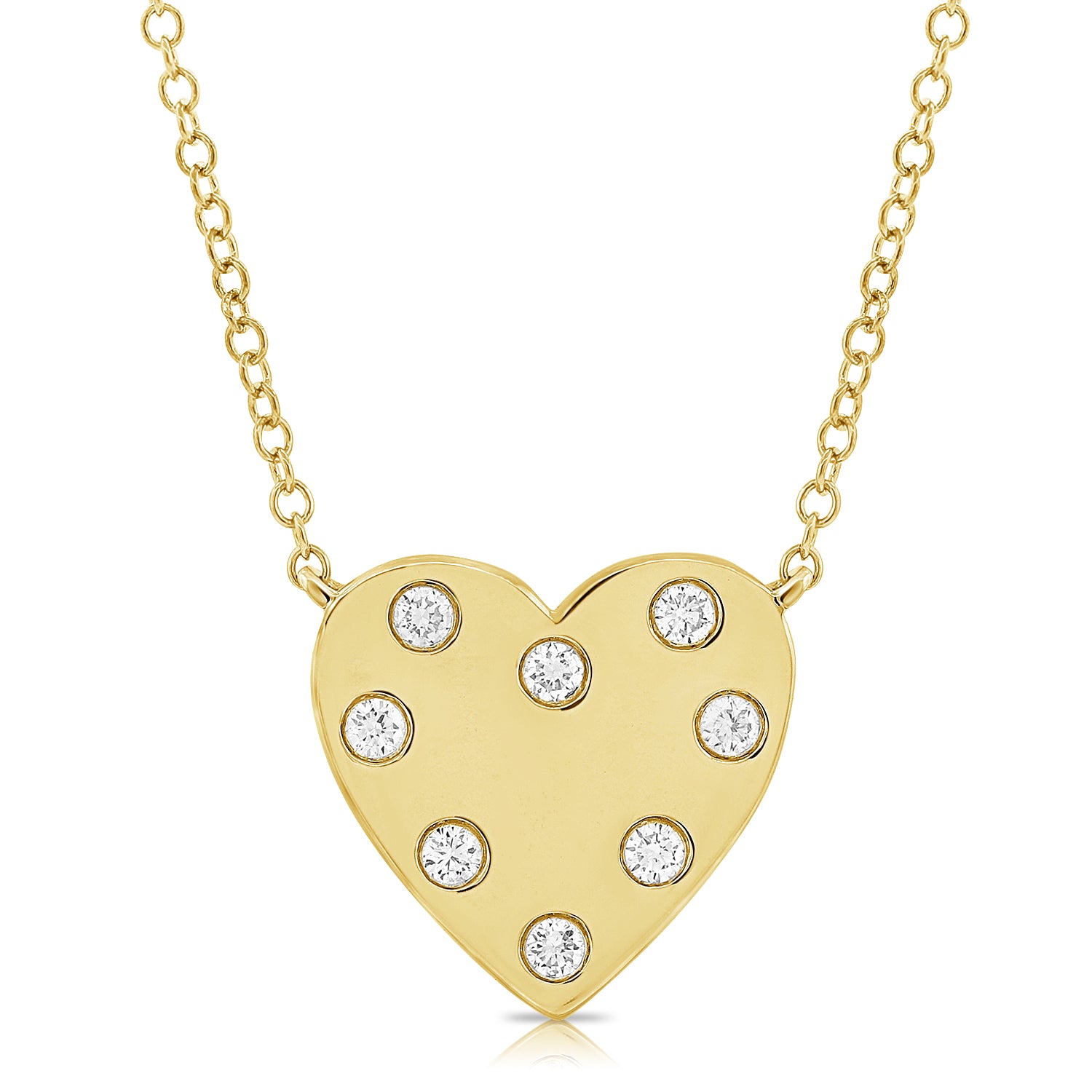 Capture the essence of love and elegance with this 14K Gold Heart Necklace. Crafted from luxurious 14K gold, the heart-shaped pendant is adorned with seven sparkling diamonds totaling 0.12 carats. Each diamond is bezel-set to perfection, creating a modern and sophisticated look that shines with every movement. The delicate chain enhances the pendant's charm, making it a versatile piece for both everyday wear and special occasions. Celebrate timeless romance and add a touch of sparkle to your collection with this exquisite heart necklace, a beautiful symbol of affection and style.